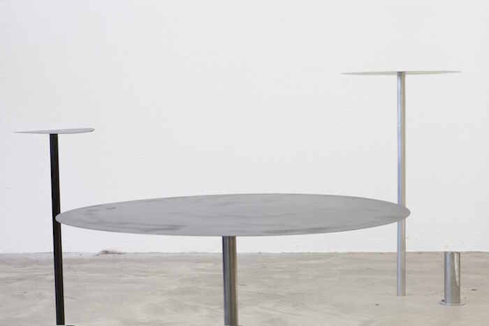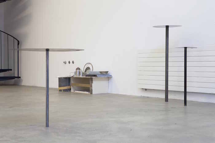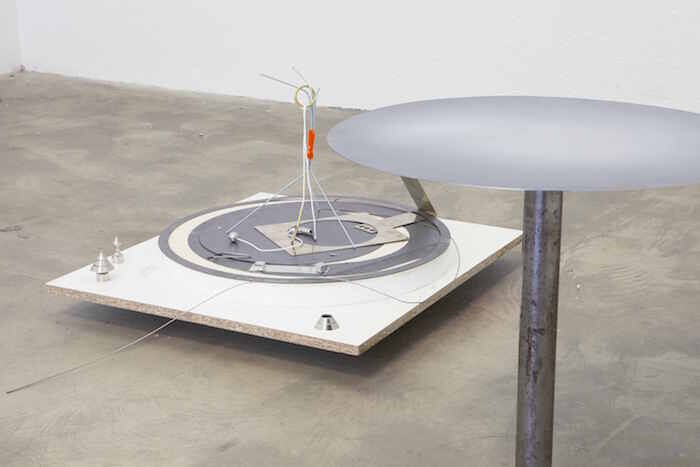 Usually writing about work or showing work remains work, after all. Both replete with materialist theory—layers of labor woven into and in between letters, or the delicately dialectic bits and pieces that make up Vorisek’s body of work. This show makes a difference. It escapes. It offers the possibility of escape. From what? Take a look at the air-shaft opened in the gallery ceiling, a black square next to neon lights. It’s the escape hatch. Actually, it’s a black hole, sucking up whatever is thrown into it. Well, for a moment (it might also just suck things into some other place). It’s a wormhole, more precisely. A loop hole, perhaps. Or rather: a loop whole. A quintessential place of Vorisek’s installation, where things are, where they are not, where they seem to be, linger, or limbo, and loop on, and on, and in and out of some (not any) body, unusual in tumbling, into tables, that turn, that dance, and keep turning. It’s this very system of rent, of metabolism, in metal, and love. A system of conversion: of interchangeability as agency as such.