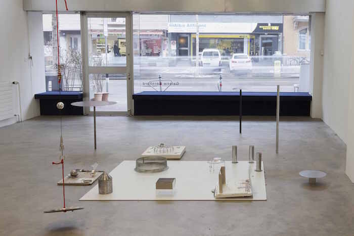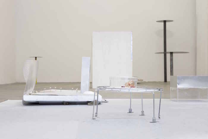 Usually we’re the ones falling into tables. At the opening of Zurich-based artist Jan Vorisek’s first Swiss solo show at Galerie Bernhard on that dark December eve, it was tables that were falling into us. Ouch! And there we were, right in the middle of his ideas, in Rented Bodies (2015), the exhibition’s eponymous installation. Or rather, the tables were right in the middle of us, who loiter around at gallery openings, fetching beer from the fridge to the tables. Yet these tables aren’t tables. They’re Art: dysfunctional mostly, too little, too pretty, too fragile. Or do they seem so just in contrast us being too awkward, tall, dysfunctional all the time, all over the place? It’s this ambiguity that unites us and the tables, in a system of rent, time, and labor on loan from each other, to perform our respective functionalities at the gallery opening, or failing by falling. And so we see much more than tables: Rented Bodies is a whole set of fragile sculptures, 100 percent design products, sampled from gift shops, collected from thrift shops, shop windows, and workshops, meticulously arranged and re-arranged into an environmental assemblage that explores every nook and cranny of the gallery, kinetic and yet barely moving.
