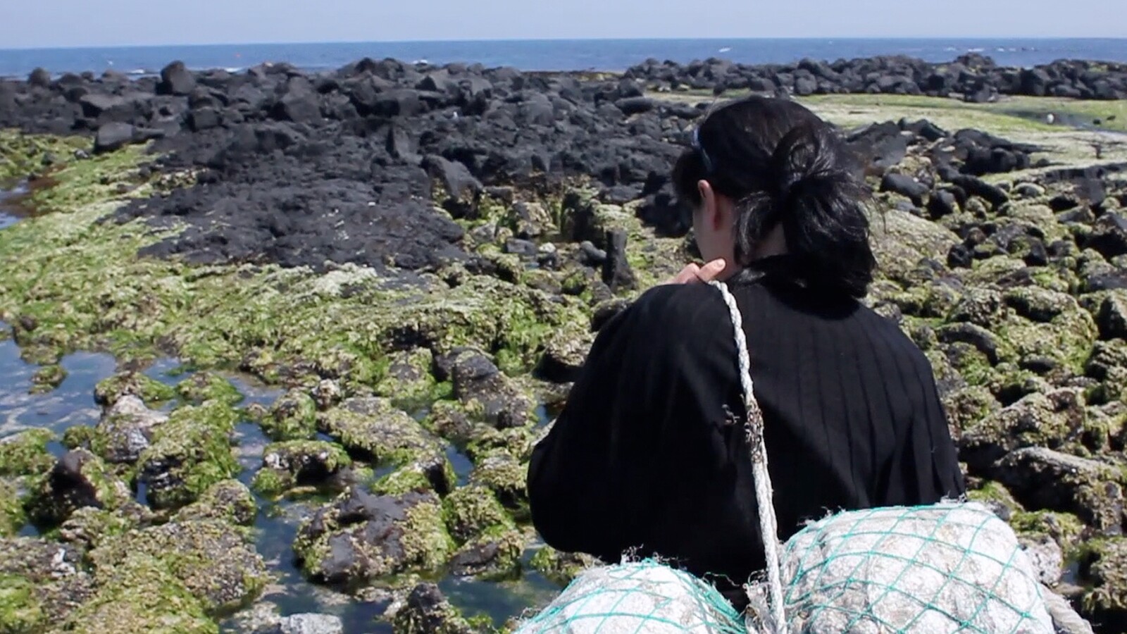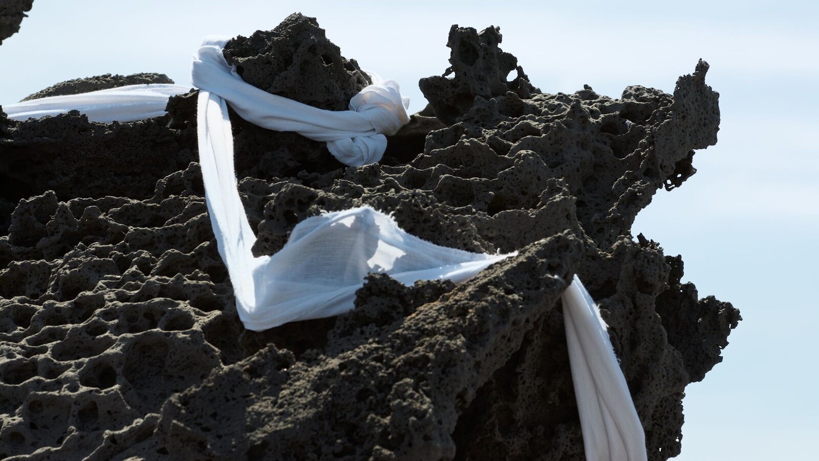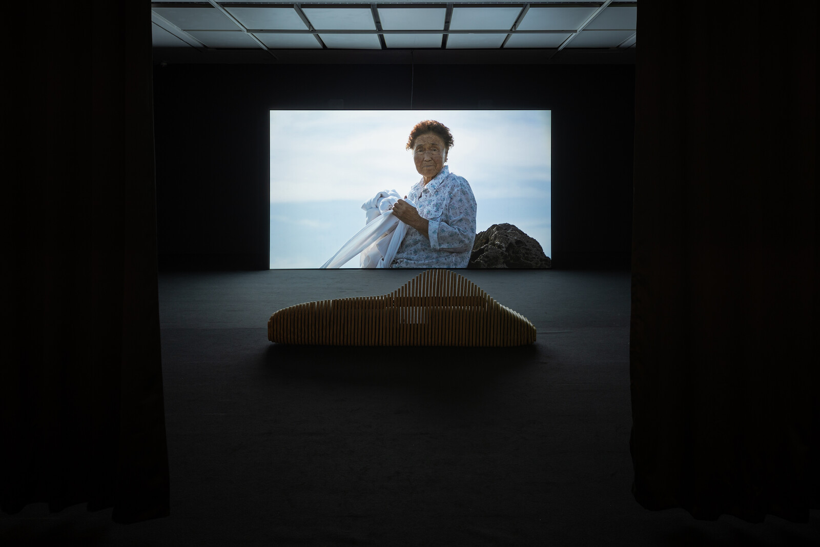 A group of elderly women labor silently, weaving and draping long sheets of white cotton around an islet of black volcanic rock. The twelve-minute film installation’s supplementary materials explain that these women have spent much of their lives working together as haenyeo—an occupation dating back centuries, in which women freedive to harvest seafood for their families on Jeju Island, south of the Korean Peninsula—and that this precise setting is one of shamanic significance, associated with the goddess of wind who gives the film its title, Halmang (2023). The Jeju-born, Denmark-based artist’s patiently observational study of these “women of the sea” emphasizes their status as workers by foregrounding, in lingering close-ups, their aged, scarred faces and hands as continuous with the aged, scarred rock. A soundtrack of crushing waves lulls the viewer, until the film’s confronting climactic image: the islet depeopled and draped in the white cotton. This land, born from geological shock and host to centuries of politically contested narrative, will outlive us all.