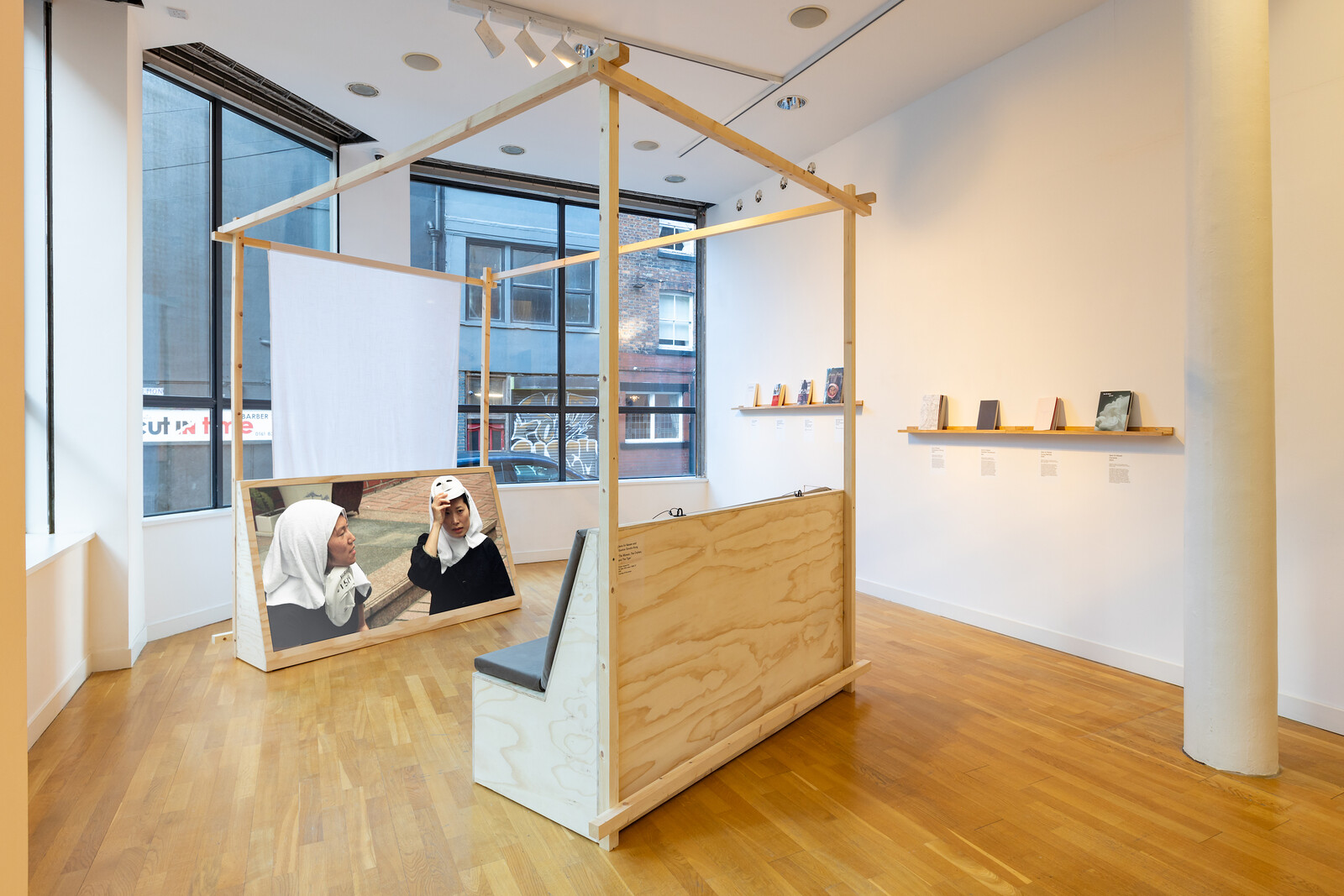 Further underscoring Halmang’s sincerely felt mode of transgenerational witnessing, the inclusion of two earlier single-channel works, both more than a decade old, demonstrate the artist’s sustained use of moving image to complexify what it means to memorialize, and to simultaneously expand and personalize legacies of cultural, geological, and political precarity. Of the Sea (2013) consists of a single take that depicts the artist walking along the same Jeju shoreline where her ancestors demonstrated eight decades previously. The film is as long as the titular, formerly banned song, associated with the anti-colonial resistance movement, that forms the work’s soundtrack and resonates through to the gallery’s reception and reading space. The feature-length The Woman, The Orphan, and The Tiger (2010), co-directed with Guston Sondin-Kung (billed as a cinematographer on Halmang), begins with a cacophony of female voices speaking in different languages, unsubtitled and layered to the point of indecipherability, accompanying manipulated footage of the Women’s International Tribunal on Japanese Military Sexual Slavery. It’s an appropriately discomforting prelude to a polyvocal documentary which seeks to give audiovisual form to the borderless webs woven by traumatic cultural inheritances.