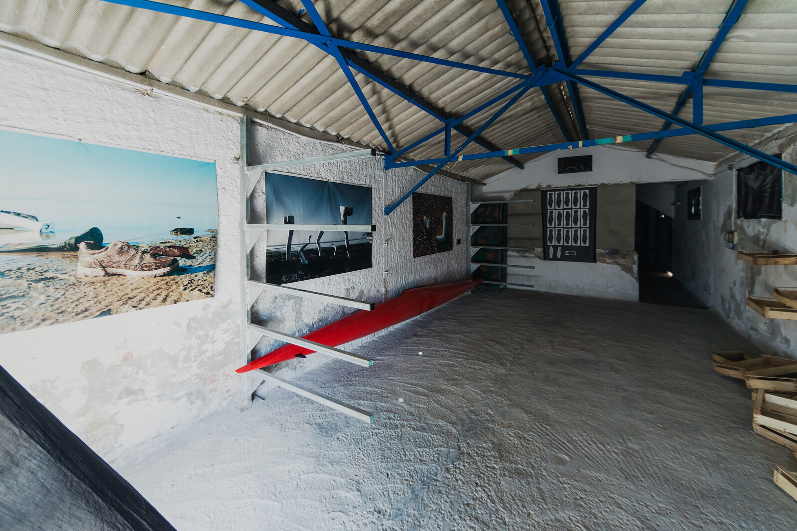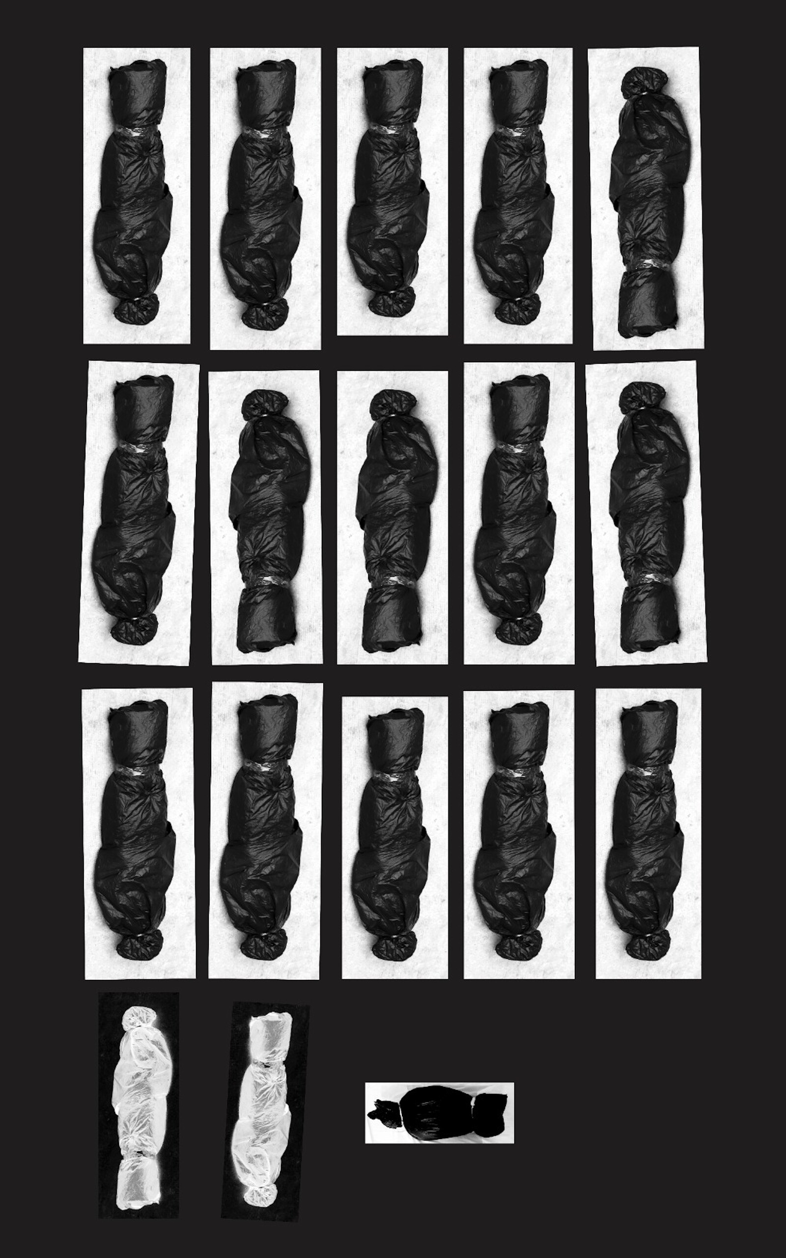 In one room, Last Words (2024) by Souhir Ben Abdallah consisted of a black-and-white photograph of a letter by a young man describing his fear of being trapped, ostensibly explaining his desire to leave the country, and an audio recording of his words being read aloud. In an adjacent space, where images were viewed using flashlights in the dark, photos by Dhia Guermit were installed amid stored oars, including one showing a trio launching a rowboat into the sea. Nearby, a digital print by Samar Tahri lined up body bags in three rows by five with two inverted white forms at the bottom, alongside a child-sized swathing. The title, 18/18 (2024), references an incident on the Zarzis coast, when a boat carrying eighteen people capsized, leaving no survivors.
