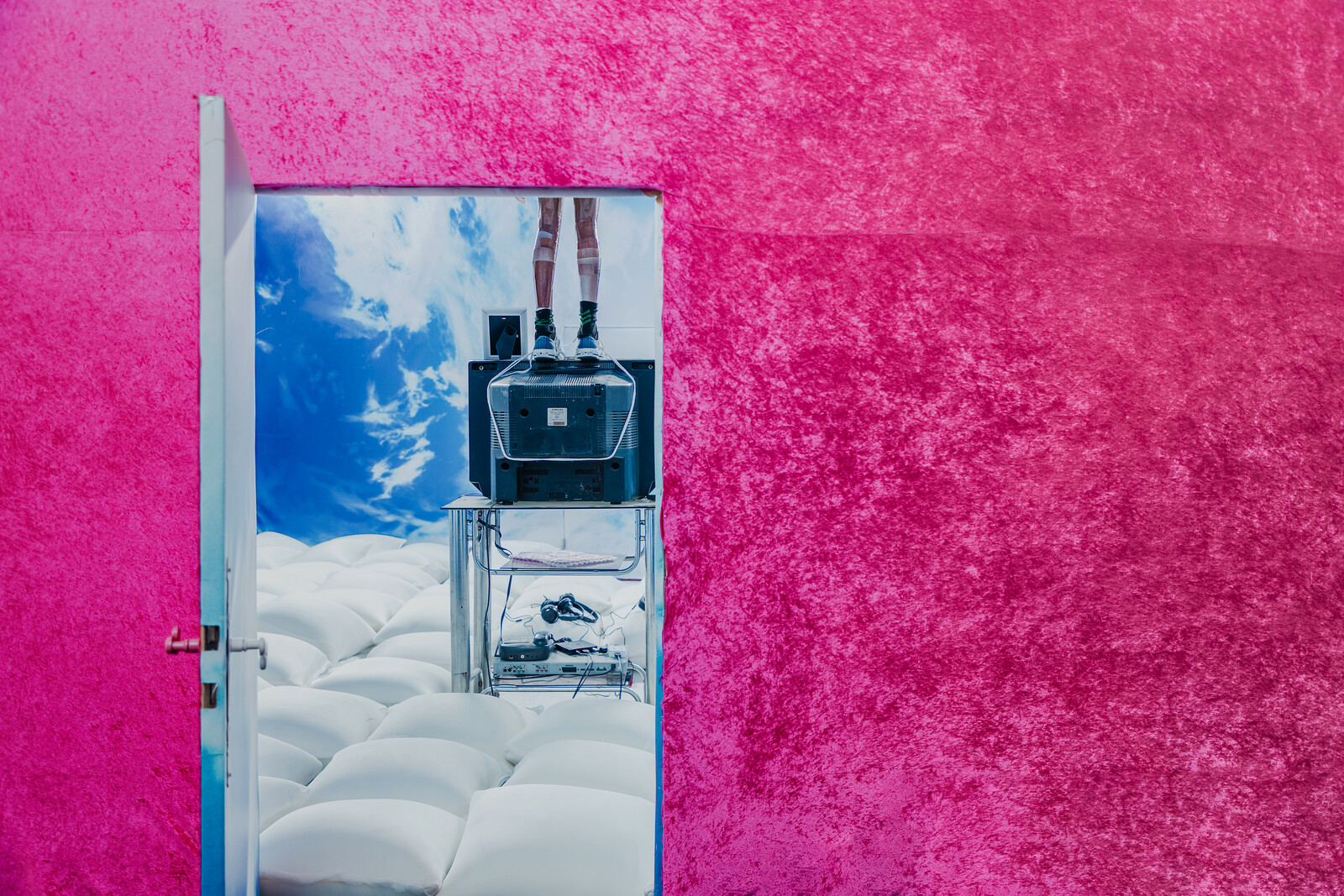 A sense of solidarity resonated across “Hopeless,” as demonstrated in works like Ouns Yajini’s close-up portraits of migrants, This is not a criminal (2024), in keeping with the theme of resistance as a form of love for Jaou’s seventh edition. That theme was palpable in Bachir Tayachi’s solo show “In My Room,” held in a warehouse next to the multidisciplinary space B7L9, where Gabrielle Goliath’s ongoing audiovisual installation project foregrounding testimonies of patriarchal violence, Personal Accounts, was screened. Billed as a three-part queer odyssey, In My Room is a Gesamtkunstwerk composed of new commissions (all 2024) reflecting Tayachi’s evolving relationship with his queer identity, starting with fuck men, an outstanding video montage that rages against the conditioning of idealized heteronormative masculinity in pop culture, and concluding with a disarmingly vulnerable untitled video of the artist and an ex-lover coming to terms with the traumas that contributed to their relationship’s demise. Given the Tunisian government’s persecution of LGBTQ+ communities, the exhibition’s opening night was a galvanizing and moving affair, with Tayachi’s community showing up to support the artist alongside allies from across the city and further afield.
