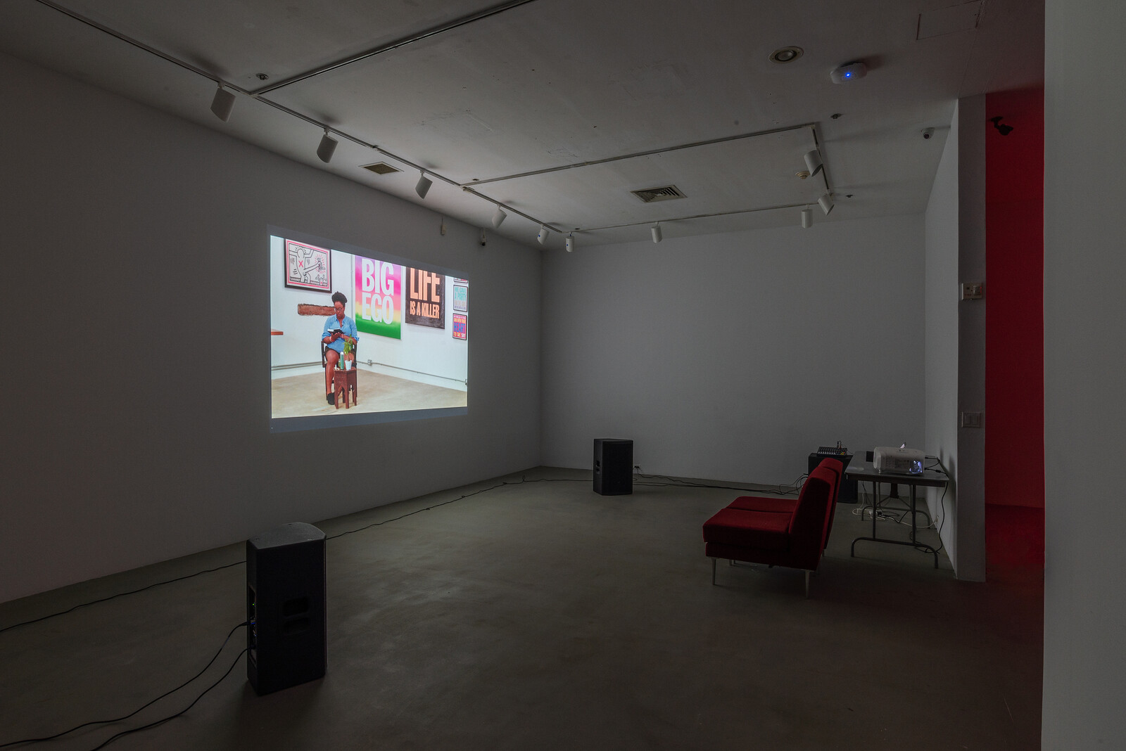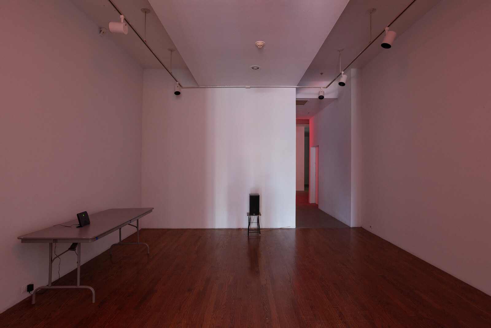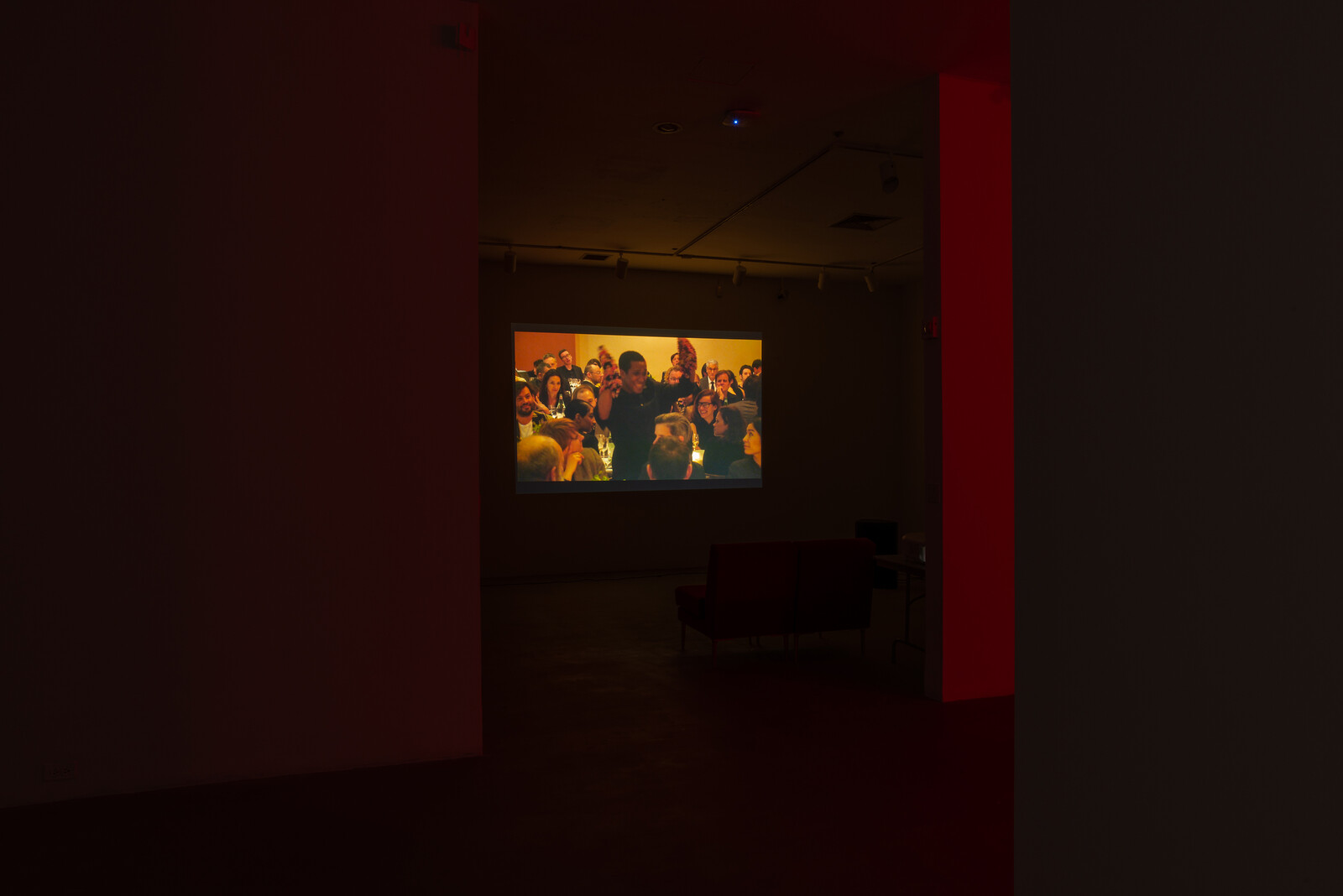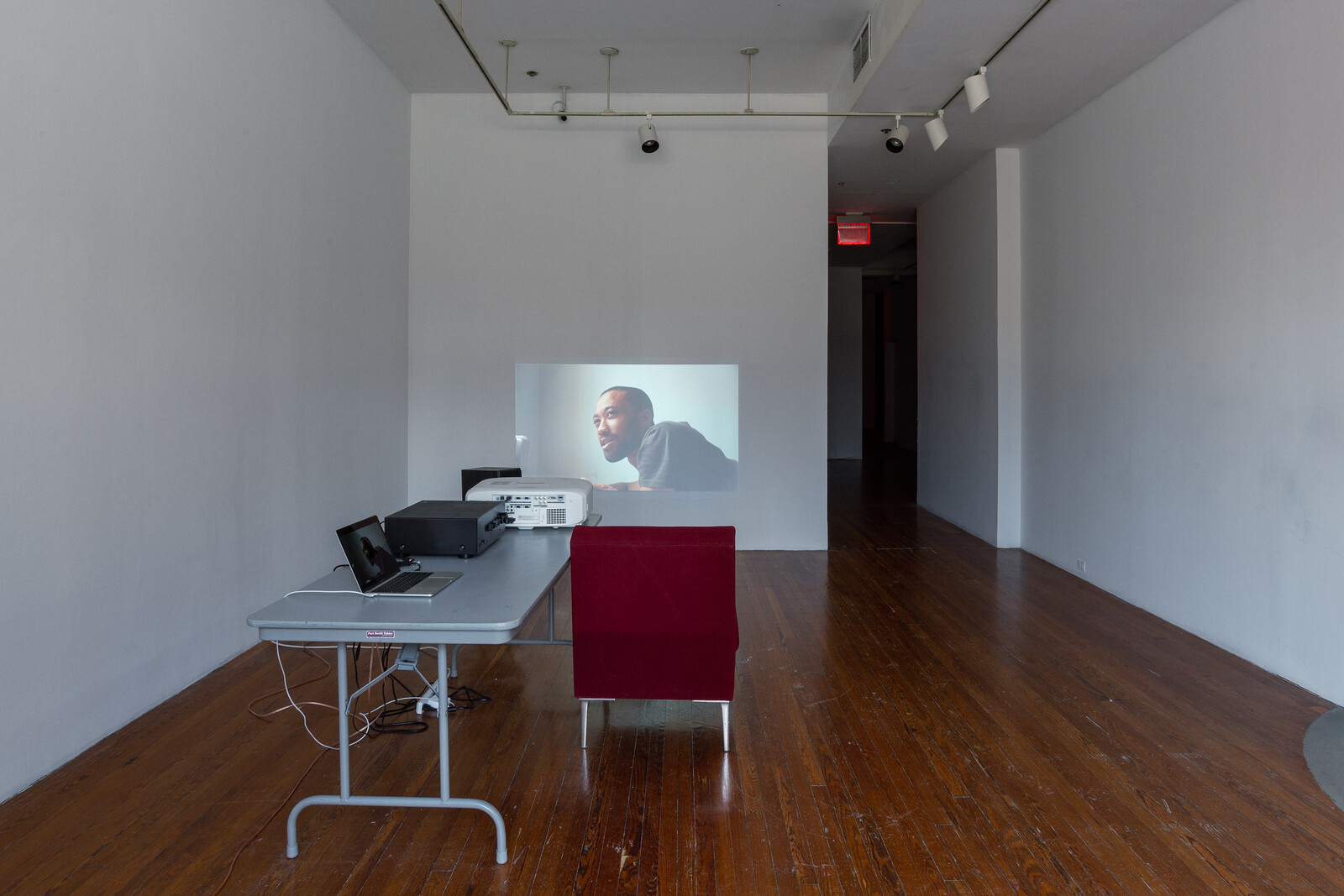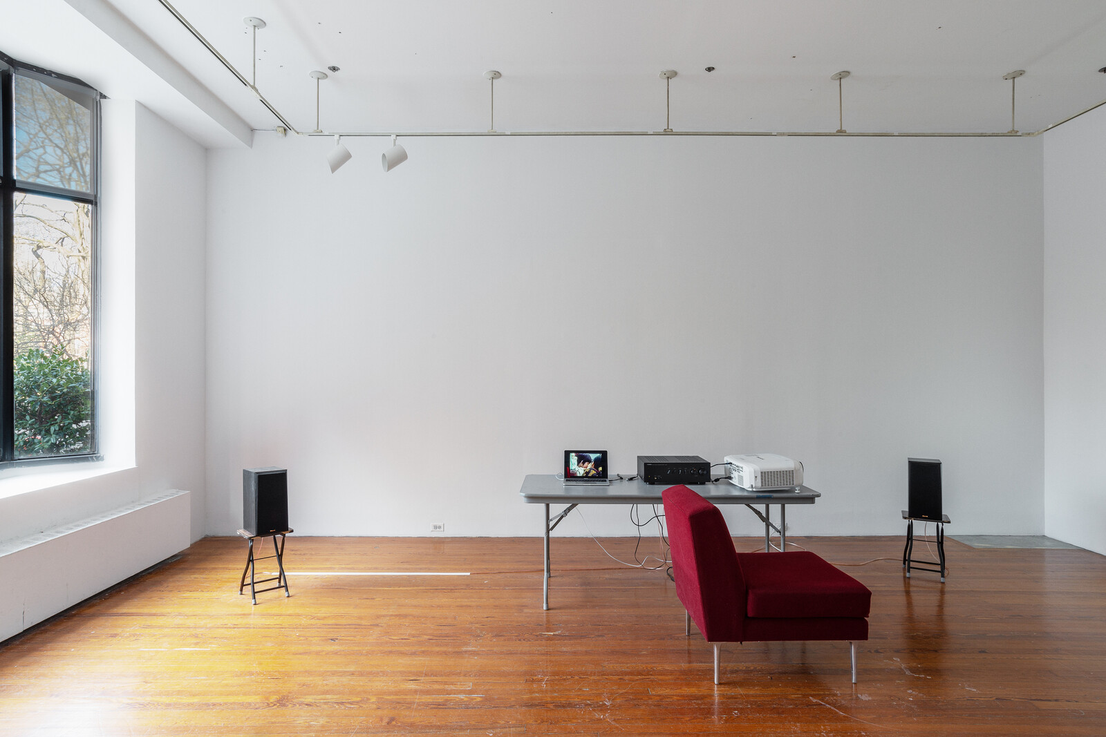 “Sometimes You’re Both” continues Hirata’s recent practice of deconstructing the solo show. For his “25 October, 2015—12 May, 2019” exhibition at Kunstverein Nürnberg in 2019, he exhibited other artists’ work under his own name. Similarly, “Sometimes You’re Both” is neither strictly artist-curated nor collaboratively billed. More liberty is taken here with the display of works than in “25 October, 2015—12 May, 2019”: technical equipment sits out in the open on tabletops. While this could be mistaken for slacker aesthetics, it’s rather another instance of the artist divulging the mechanics of artistic production—or, perhaps more specifically, the invisible labor behind installation. Films play from laptop to projector in a visible circulatory system. The presentation is also an economy of means: fire exit signs light the space, couch chairs from a previous show provide the seating. In parallel, Hirata’s contribution to a group show held at the nearby Artists Space is an installation of surplus projectors from 80WSE’s inventory.