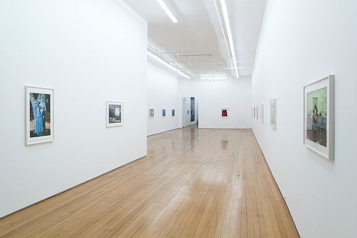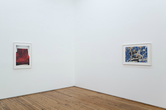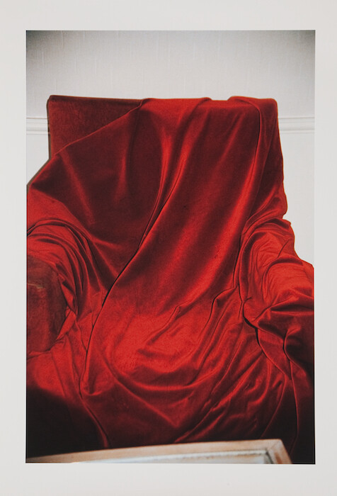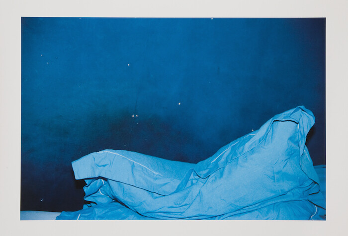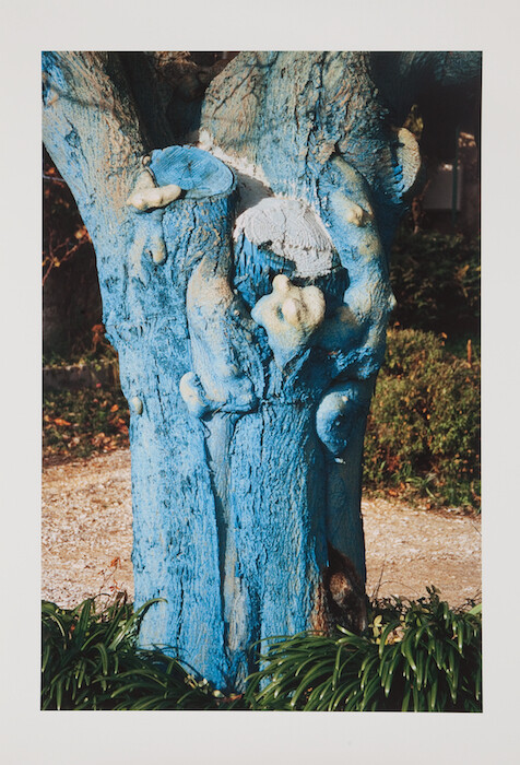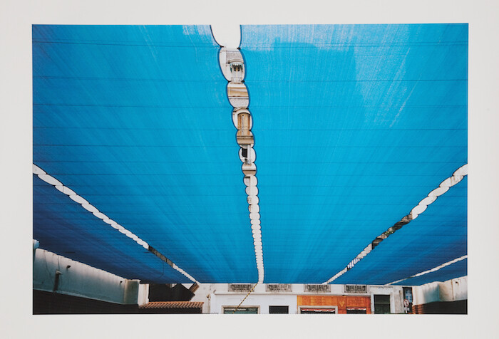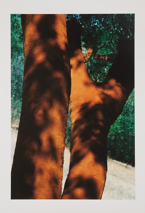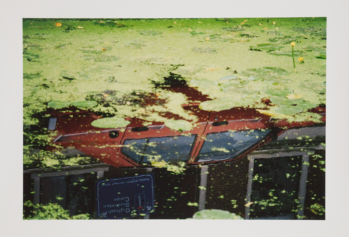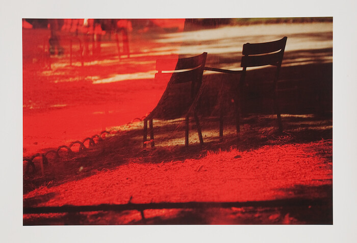 In “Ultimate Paradox,” swaths of rich, saturated color hang across each of 20 framed photographs. Rust-hued powdery tree trunks overshadow a flittering, out-of-focus leafy green background (Alentejo, 1993), an angle which would have required the photographer to climb several meters into the tree’s branches; the acid-azure knotted tree trunk shot in Vaucluse (1992) matches an overstuffed pillowcase in Paris (1985) and a taut plastic tarp ceiling installed in Rio (1996); the dripping crimsons of two lone cafe chairs planted outside in late-afternoon Luxembourg (2003) mirror the sanguine velvet regally draping an armchair in Sainte Beuve (1987); and the reflection of an orange car buoys upside-down on an inky pond camouflaged by celadon and electric chartreuse lily pads in the gorgeous Brugges (1997), whose delicate floating leaves’ green is picked up in a pair of ragged concrete posts on the shore caked with moss streaks of the same shade in Amsterdam (1992). Titled after the city in which it was taken, each giclée print, screened on pure cotton paper, is empirically visually pleasing, a tasteful selection of aspirational-lifestyle and global-traveler snaps.