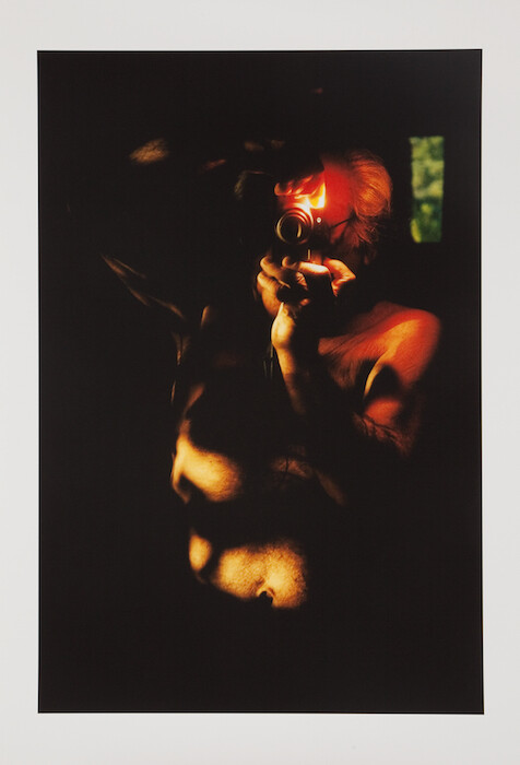 Baudrillard did make one exception to his rule against shooting human subjects: Corbières (1999). Standing shirtless in front of a full-length mirror, Baudrillard’s face is covered by his camera, sparking a fiery flash that creates a few flaming patches of light on his skin as he stands in a charcoal shade. His assertion that any scrambled image takes on an erotic charge(4) is perhaps too narrow a statement to include his self-portrait, since it appears as if his hesitation about stepping out of the shadow completely would open him up to being labeled a fraud, or even worse, for pointing to the fact that his artwork has a high profile because it rests on his reputation as one of his generation’s most highly regarded public thinkers. Taking this photograph and demurely making it public is an admission of his pleasure in participating in art. He is not seducing, but hiding.