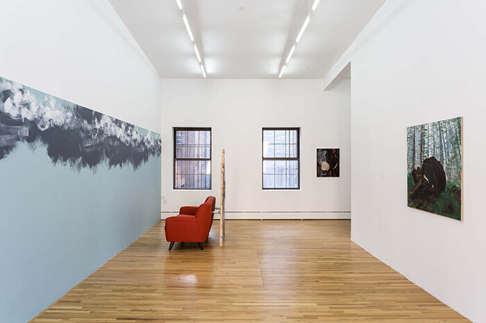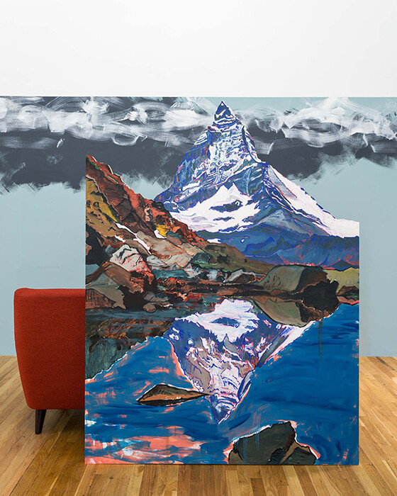 The scope of the adjacent artwork (Another Double Mountain and the Modern Sofa) feels radically different, with a sort of ugly modernist sofa affixed to an upright painted panel featuring the Alps’ Matterhorn. In the painting, the mountain’s blue peak is reflected in the waters of a deep pool at its base, with bands of paint leaking downwards. A second smaller slope bisects the image, supersaturated with rust, ochre, and peacock green. Representing the Matterhorn is more the province of a nineteenth-century landscape painter than that of one based in New York in 2016, and the appendage of a mid-century couch amplifies the work’s anachronism. Distinct from historical renditions, however, Mundt’s Matterhorn is in conversation with the fact that the iconic peak lends its image to a Disneyland rollercoaster as well as to a tourist industry that streams billions of dollars annually into notoriously tax-evading Swiss bank accounts. Alongside The Revenant, which the mountain range faces in the gallery, Another Double Mountain might be understood as an exercise in working through the nationalist narratives—clichés among them—to which the artist, having grown up between Switzerland and the US, has been subject.