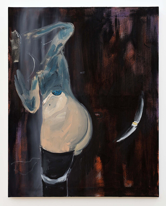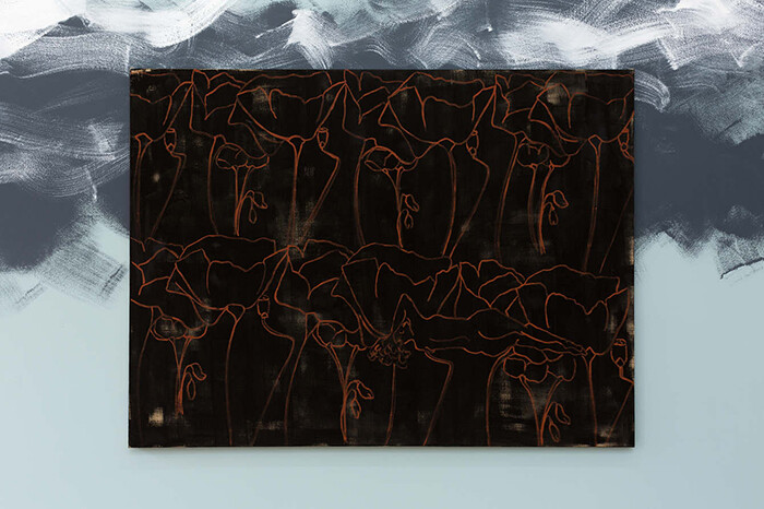 One of the gallery’s walls is painted a continuum of a light, generic blue, over which dark blue and white are roughly applied, a shorthand for clouds. Hanging directly on this surface is Passed Out in the Poppies, whose black background hosts two rows of flowers simply sketched in red. Among these a woman lies prone, though her outline is not immediately visible against those of the poppies. Her inconspicuousness reads like at first like a happy privacy—the luxury of being naked, yet unseen—but whatever measure of peace this affords her becomes more sinister in light of the poppies’ psychoactive properties. The exhibition’s title, borrowed from a 2015 HBO documentary of the same name, tracks eight young heroin users living in the Massachusetts peninsula whose experiences presumably speak to the reality of America’s opioid epidemic, which is currently reported to claim 125 lives a day—a rate nearing that of H.I.V. at its peak mortality. Made by the same producer as the 1999 documentary Black Tar Heroin, the film is said to be especially harrowing; the gallerist warned me not to watch it.