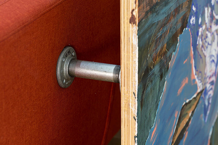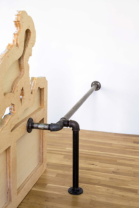 Fixed upright by an armature of steel pipes, Climbing formally mirrors Another Double Mountain with a similar painted wood panel; in this case, it’s carved into the silhouette of a woman nude and kneeling on a bed. What she’s doing isn’t especially legible; it seems like she’s making the bed but it could be something sexier. As with the exhibition’s other intimate portraits, it’s difficult to place her in relation to Mundt’s icons of nationhood or masculinity, other than to think of her as a picture of what it’s like to live among and through the latent structures (including art historical ways of seeing) that give and take meaning from the lives of women.
