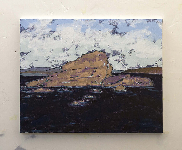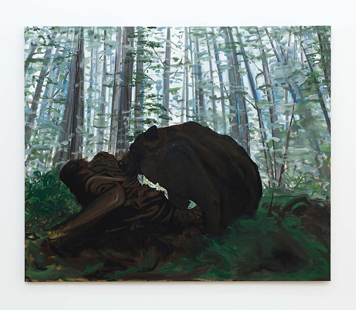 The Revenant reproduces in paint a film still from the eponymous movie, released last year: the colonial drama writ large and expensive. The film’s protagonist is real-life nineteenth-century American frontiersman and fur trapper Hugh Glass, who, after being attacked by a bear and abandoned by his collaborators, seeks violent retribution. History is malleable in the hands of those who have profited from it, and Glass’s story, among others, has been re-imagined in retrospect in service of an evolving American colonial imaginary many times over. In Glass’s lifetime, the narrative celebrated his spirited endurance; in the twentieth century, it came to represent a time before the frontier was closed. This most recent iteration sees Glass redeemed in bloodshed, becoming whole through brutality. In Mundt’s painting, two brown shapes, roughly those of a man and an animal, wrestle on the forest floor.
