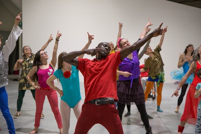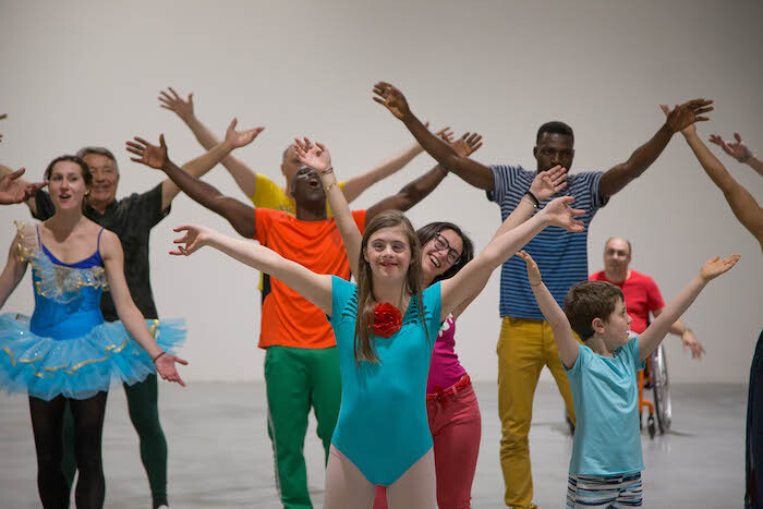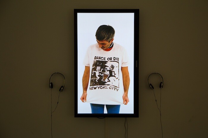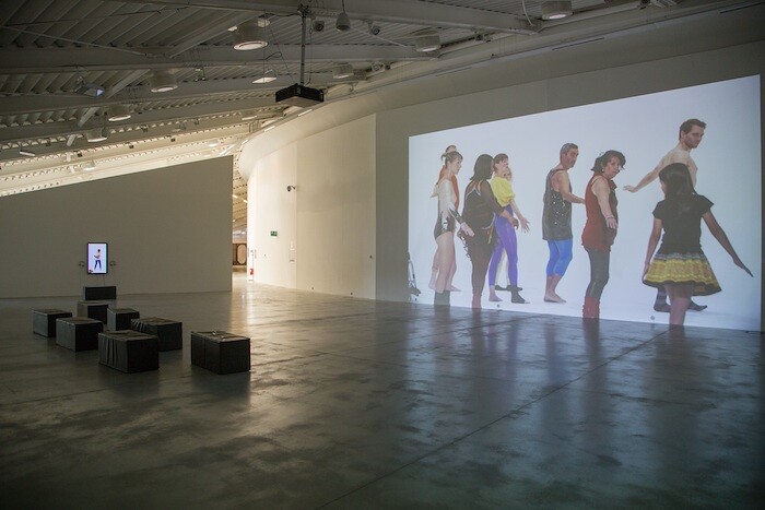 Performances like Shirtology (1997), where dancer Frédéric Seguette interprets the instructions of the graphic t-shirts he keeps on changing (“Dance or Die,” “Shut up and dance,” “Stay Cool,” “Replay”), and Véronique Doisneau (2004), where, on the night before her retirement, the eponymous dancer from the Paris Opera describes to the Opera’s own public her lifelong experience as a ballerina, are presented as autonomous films, projected on a wall or on enclosed by a large digital screen. Other works in which acting and spoken word take center stage, like Pichet Klunchun and myself (2005) and Disabled Theater (2012), are confined to small monitors in the documentary room. Every Sunday, the film Company Company comes alive as Compagnia, compagnia, performed by Prato-based amateurs, so that the same choreography and its characters morph into an energetic, site-specific, and more “authentic” version. It’s a calculated effect—despite his engagement with inclusivity, Bel steers away from improvisation. In delegated performance, Claire Bishop writes, the author outsources authenticity, so that it “is invoked, but often questioned and reformulated, by the indexical presence of a particular social group, who are both individuated and metonymic, live and mediated, determined and autonomous.”1