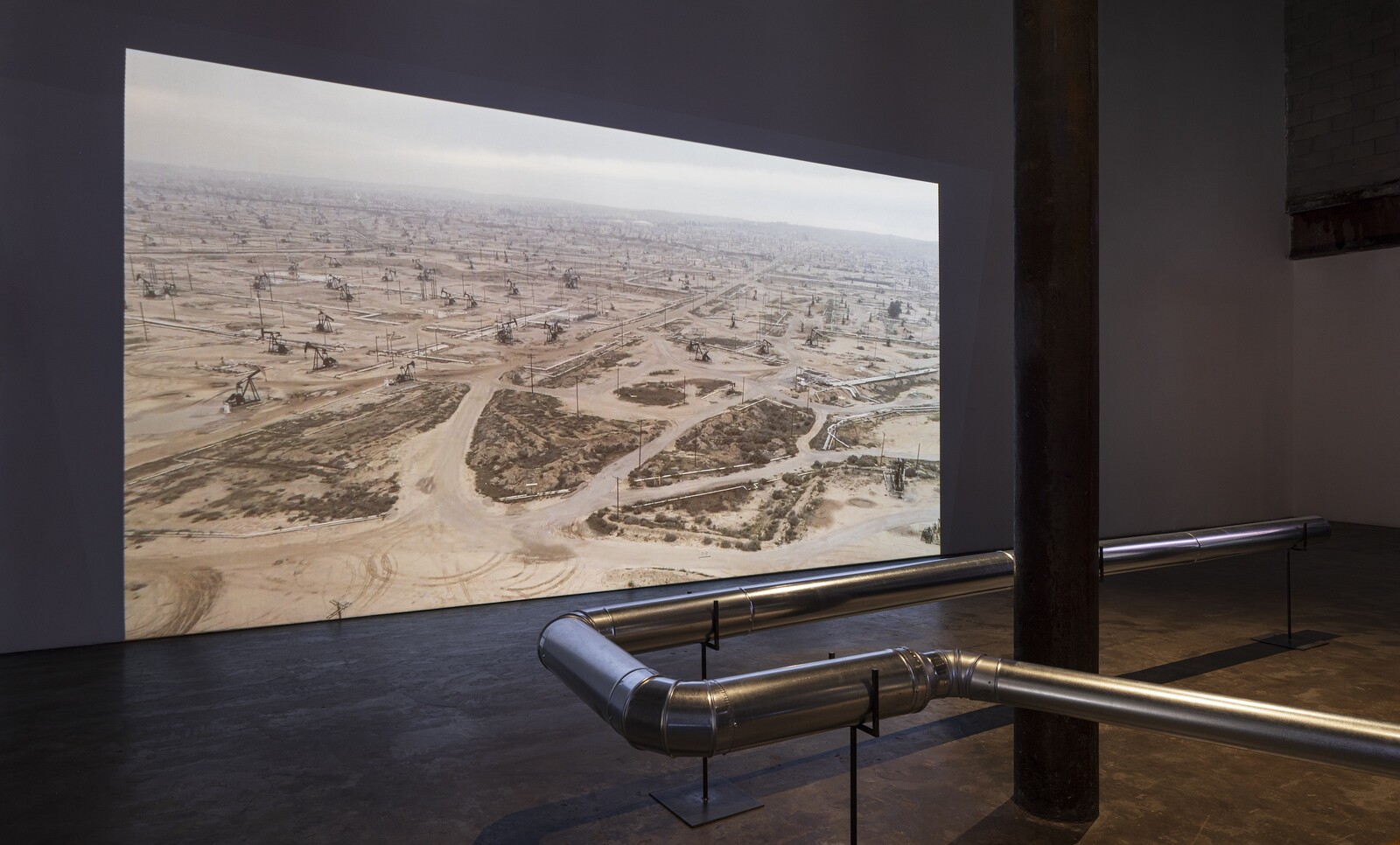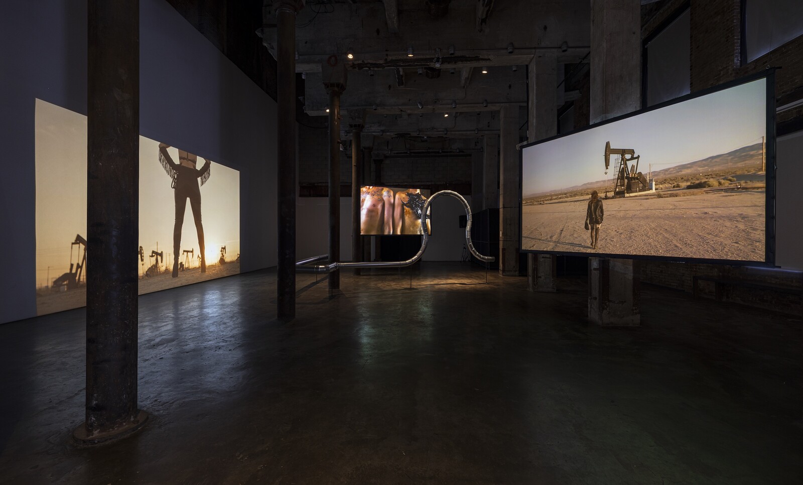 Another video opens with Segall, donning leather pants with arms akimbo, playing dominatrix as she surveys her dominion: the pumpjacks at work. (Of course, in light of our dependencies on oil, it is unclear exactly who is dominating whom.) Subsequent drone footage gives a birds-eye view of Kern County’s pumpjacks and pipelines, petroleum infrastructure extending as far as the eye can see. Time moves at a crawl, stymying oil’s global flows while alluding to the geological timeframes by which it is produced and the slow violence of its extraction and consumption.