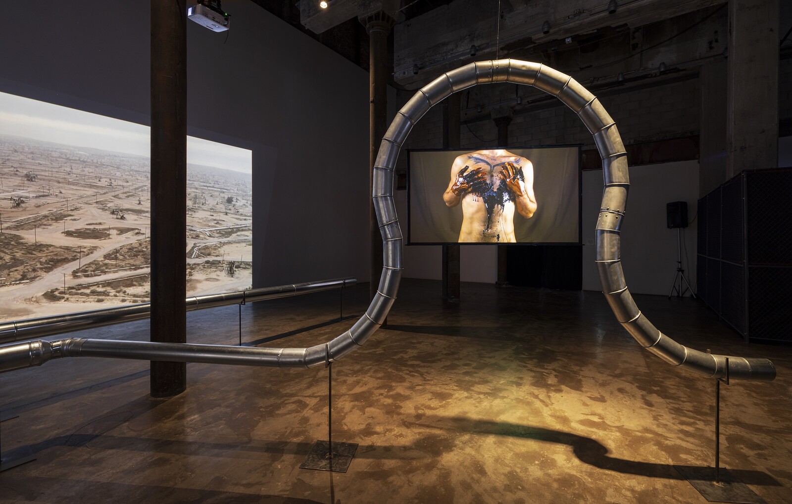 An archway is formed by a sculpture resembling the stainless-steel piping expansion loops used to accommodate thermal expansion and contraction in pipelines. Such allusions to interior dynamism, albeit on a dilated time scale, conjure up the human body’s various pulses. In the next video, two fingers—then a fist—are suggestively inserted into a pool of thick, black crude oil. When a set of hands surface, they are so densely slicked that they appear to be wearing fetish PVC gloves: pleasure-giving kink apparel derived from petroleum byproducts. Anonymized by close crops, performers rub the oil onto their torsos and backs. Segall filmed these scenes in Naftalan, Azerbaijan, where crude oil baths, touted as therapeutic since the twelfth century, became a popular treatment at Soviet-era sanitoriums.
