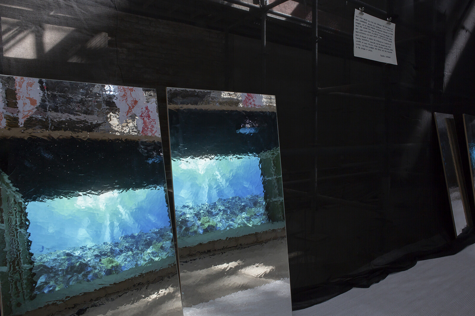 By contrast, the second room is full. Above eye level are suspended prints and ink drawings of different fish species traced in the artist’s signature calligraphic style—a continuation of her fish drawings developed in preparation for the installation and performance series Reanimation (2010/12/13), which she described as “a descent into liquid, an absorption in activity and the actualities of the archeology of the ocean.”2 Thin sheets of acrylic mirror and Murano ripple glass are positioned along the walls, to reflect and multiply the five wooden structures positioned at the center, building upon her “My New Theater” series (1997–ongoing). Two are small “looking boxes” (or miniaturized cinemas) mounted on wooden legs, while three are large walk-in boxes that allow viewers to sit next to the screens and add their shadows to the glowing video projections.