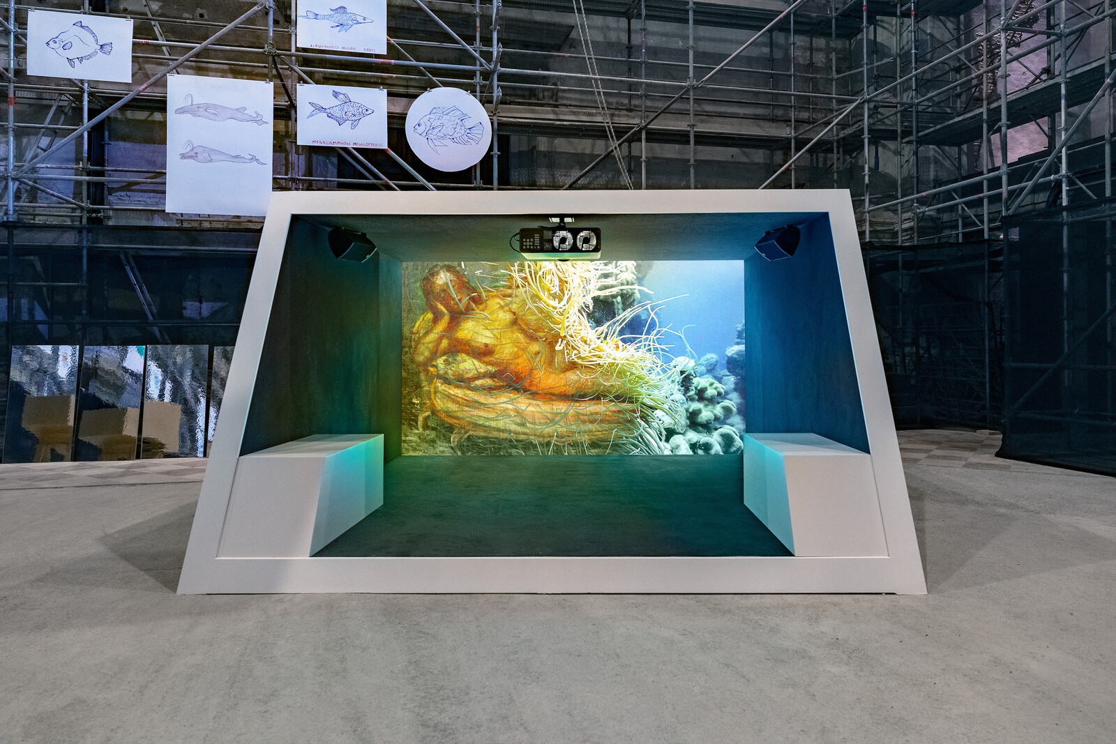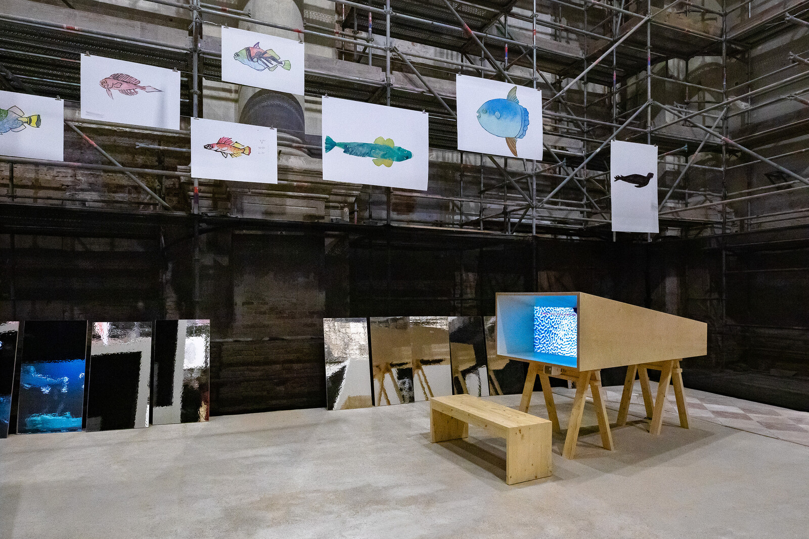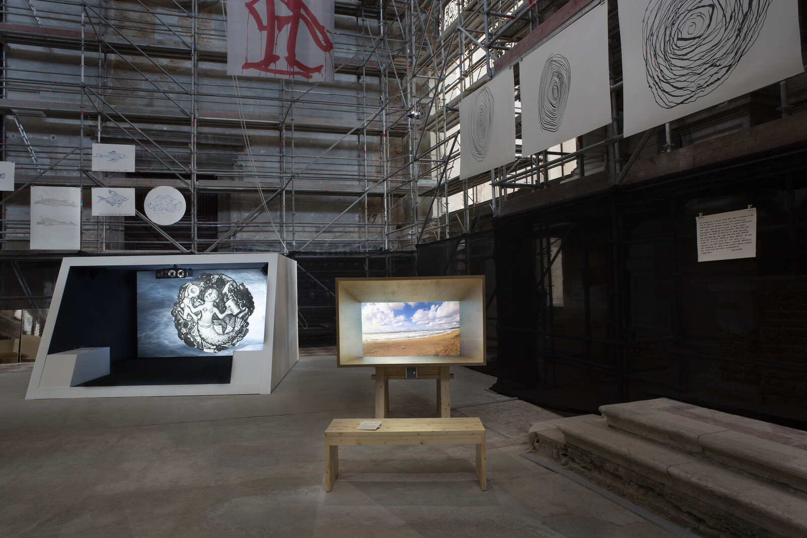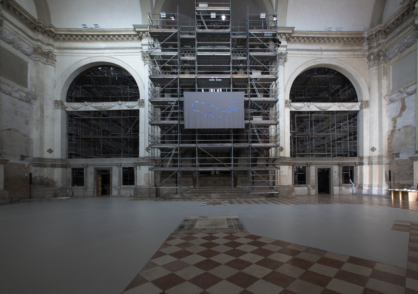 The exhibition occupies the cavernous architecture of the former Church of San Lorenzo, the interior walls of which are covered in restoration scaffolding, in two different ways. The front room is left empty, except for a large painting of a sperm whale installed above the main altar. A sound piece immerses viewers in the loud, clicking vocalizations emitted by the whales to communicate with each other, reverberating across the vast nave: a language that humans are unable to understand, despite being endowed with the same hearing apparatus (the semicircular canals of the inner ear) as all jawed vertebrates. It’s in this space that Jonas twice performed Moving Off the Land during the chilly (and very wet) opening week of this year’s Venice Biennale.