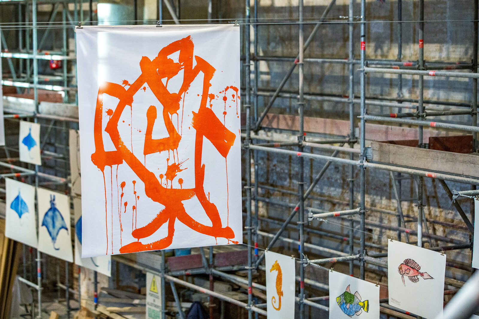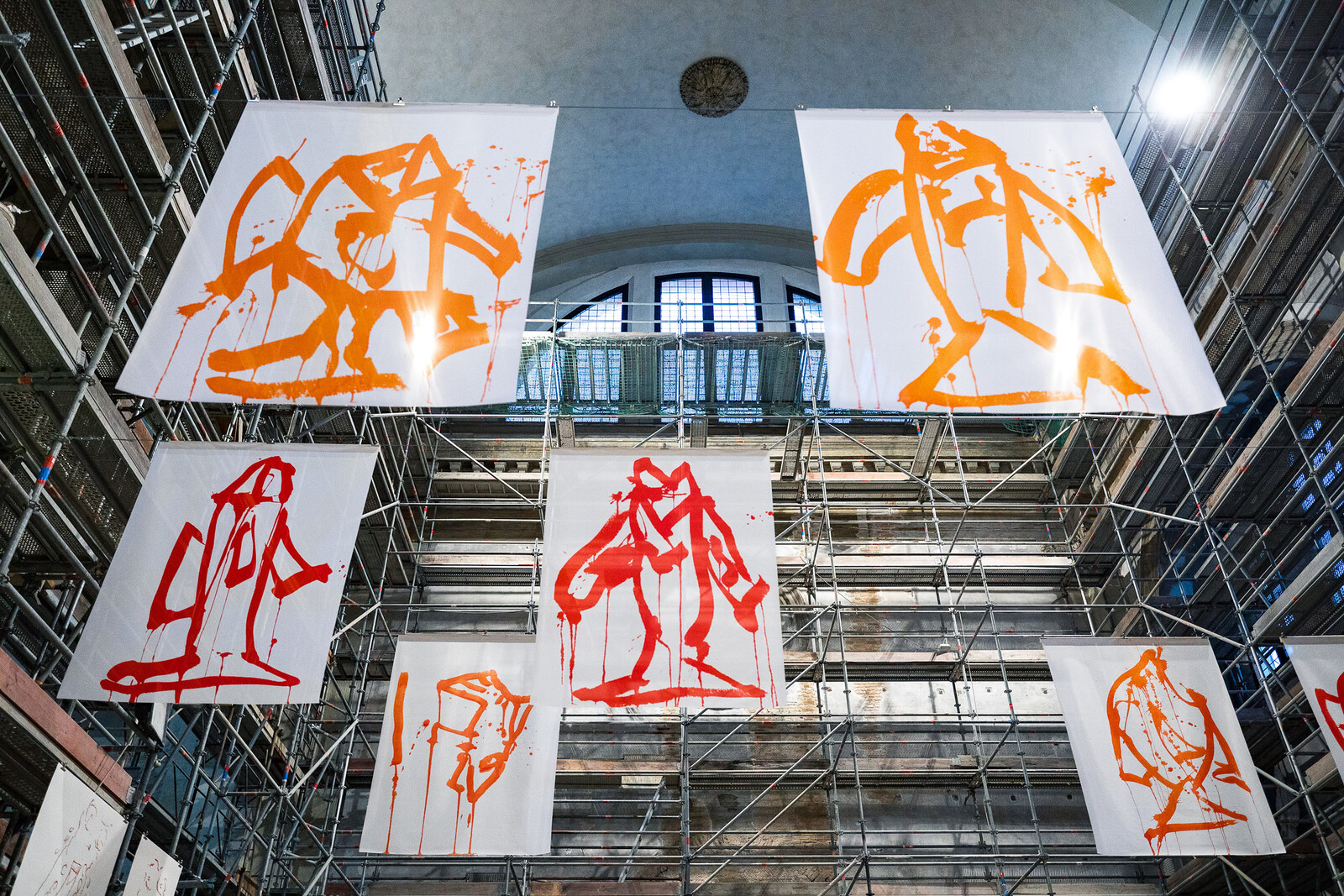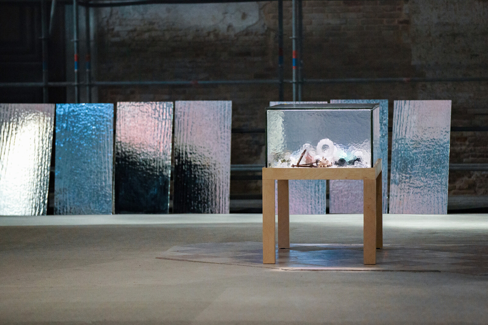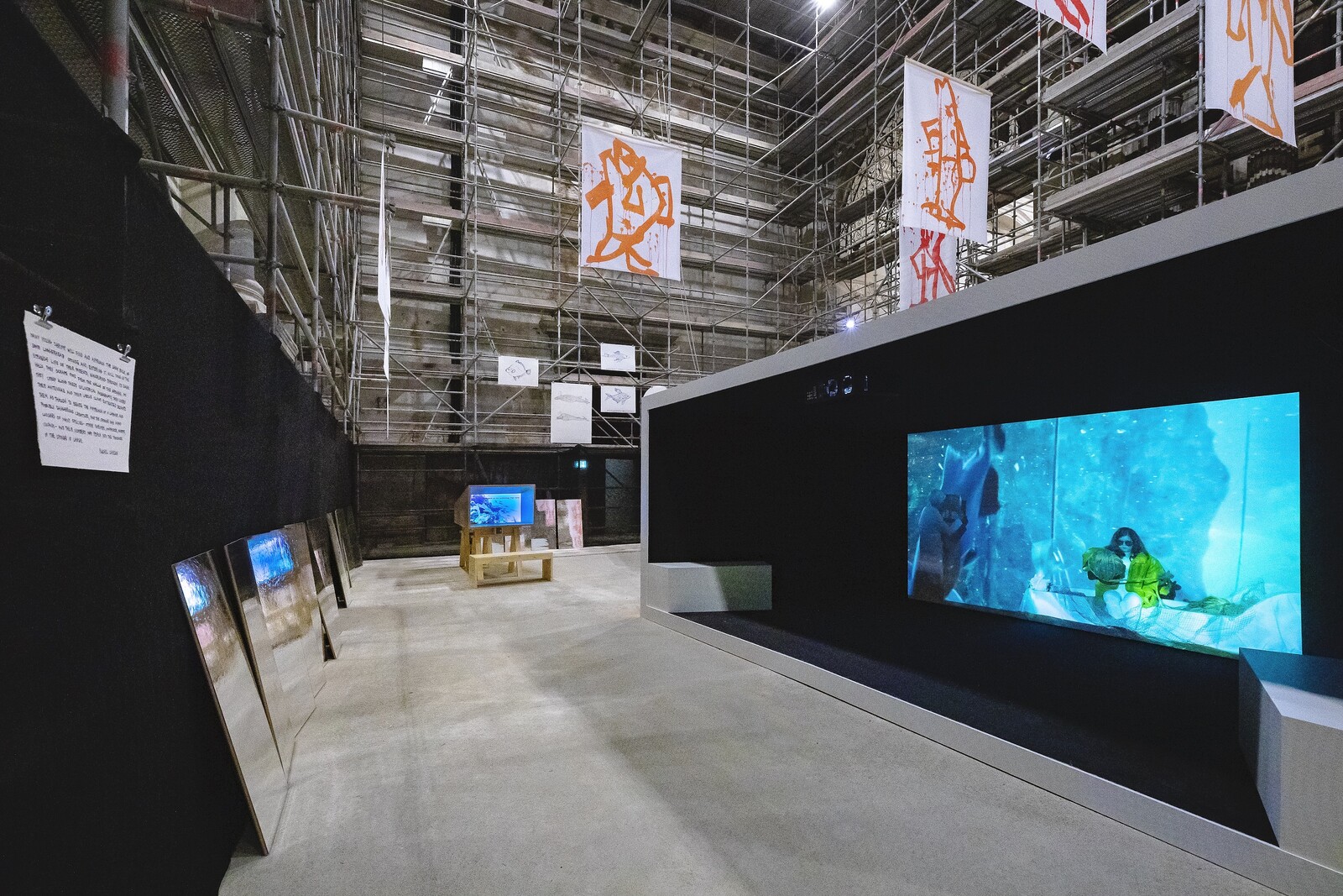 The exhibition occupies the cavernous architecture of the former Church of San Lorenzo, the interior walls of which are covered in restoration scaffolding, in two different ways. The front room is left empty, except for a large painting of a sperm whale installed above the main altar. A sound piece immerses viewers in the loud, clicking vocalizations emitted by the whales to communicate with each other, reverberating across the vast nave: a language that humans are unable to understand, despite being endowed with the same hearing apparatus (the semicircular canals of the inner ear) as all jawed vertebrates. It’s in this space that Jonas twice performed Moving Off the Land during the chilly (and very wet) opening week of this year’s Venice Biennale.
