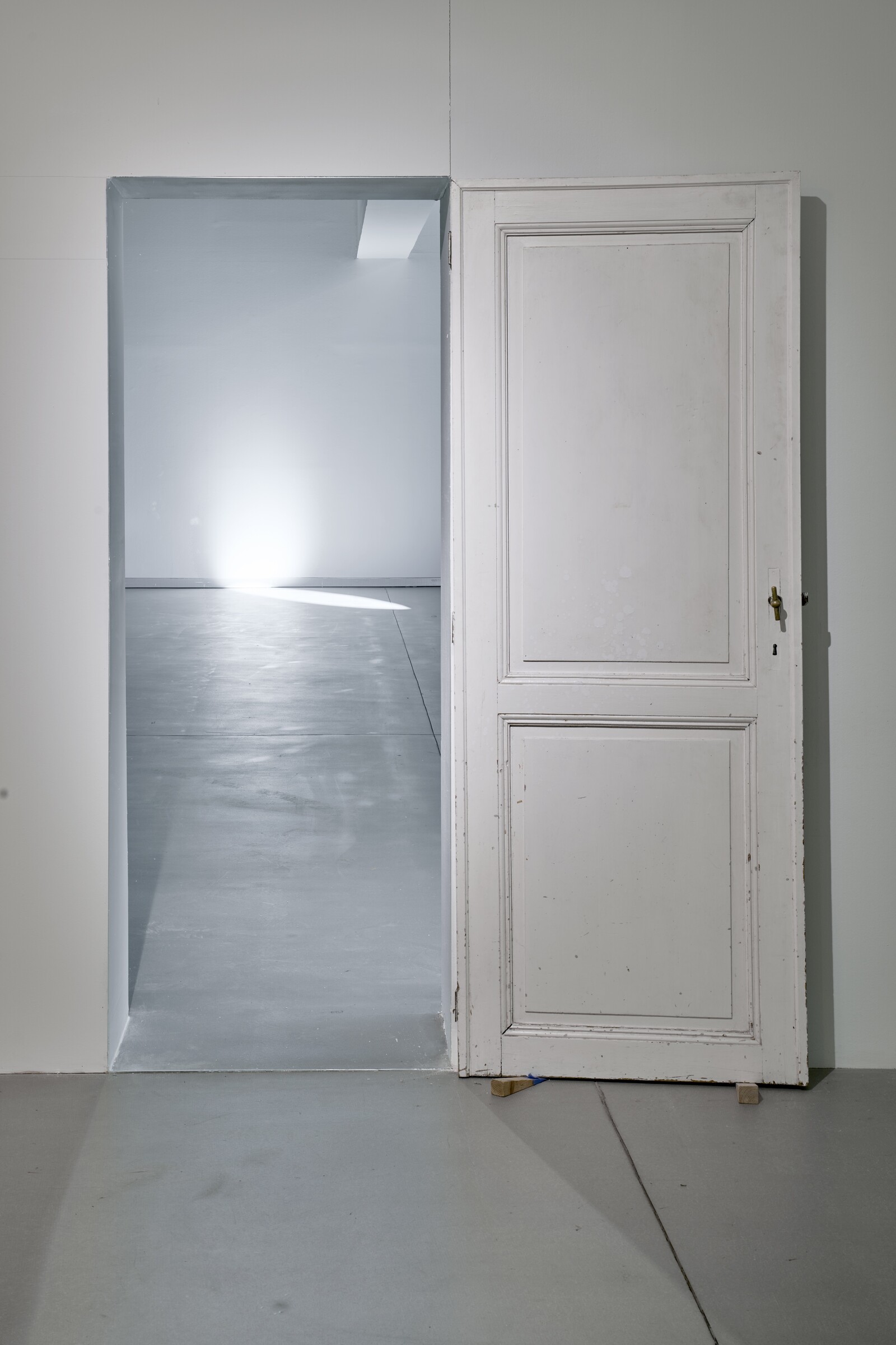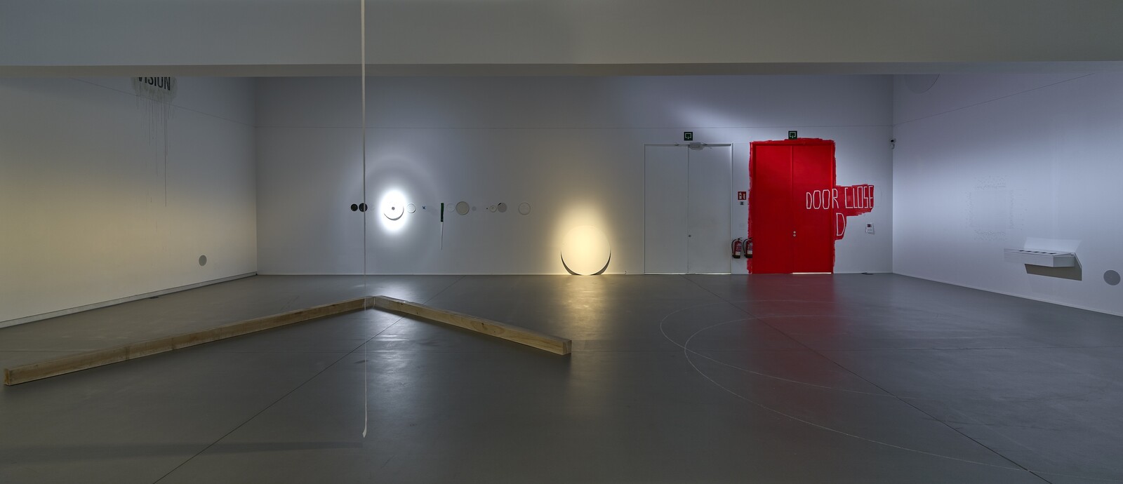 Across the museum’s six subterranean galleries, lights turn off and on at random-seeming intervals. Holes are cut into the walls. A room is rendered inaccessible by a sheet of Plexiglass. A printed text, affixed to the wall beside a fire exit haphazardly covered in lurid red paint, might have been written by a sentient fire alarm: “Hello dong ding dong drriiiing,” it says. Such interventions are in keeping with the spirit of early works such as Dacht en Nacht.MUSEUM OPEN 24/24 (1997), in which the artist opened a museum for 24 hours, with bright lights at night and darkness during the daytime. At once disorienting, atmospheric, and tongue-in-cheek, Tuerlinckx’s works heighten the viewer’s awareness of how the meaning ascribed to art is conditioned by the contexts in which it is encountered. But where exactly do those contexts begin and end?