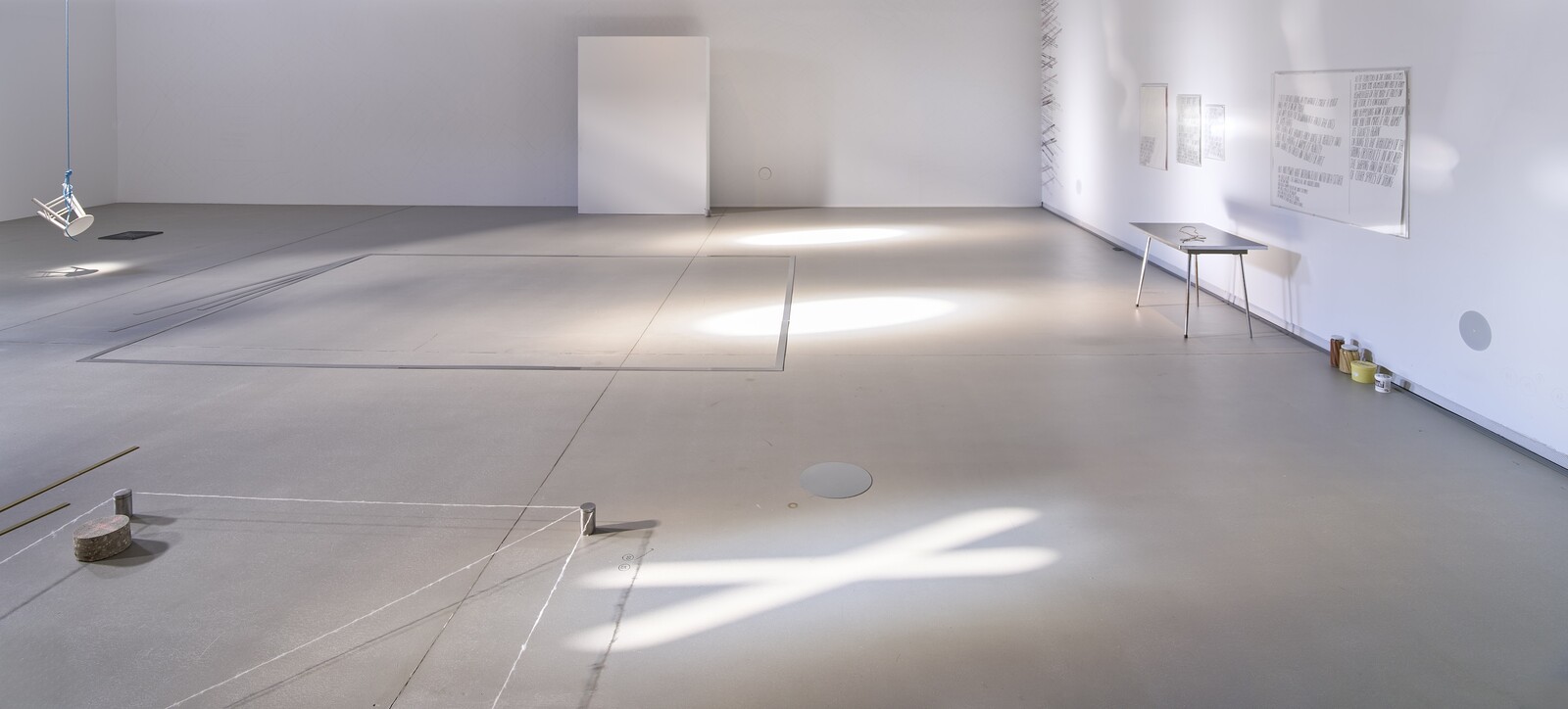 In the third and largest room, with its high ceilings and circular windows, squares and rectangles are outlined on the floor in metal, shredded documents, string, and text (“EVERYTHING YOU SEE HERE,” reads one, “DOES NOT EXISTE” [sic]). Dotted here and there are sculptures, such as a spotlit stool hanging on a blue rope, with sketchy wall-drawings (scratchy marks, an Agnes Martin-style grid) by turns hard-to-read and crisply legible as the lighting turns off and on. The overall impression is of a constellation of clues, at once ephemeral and highly charged.