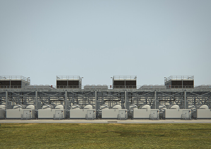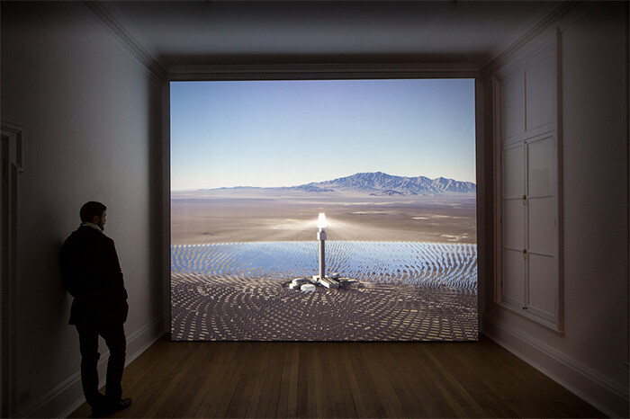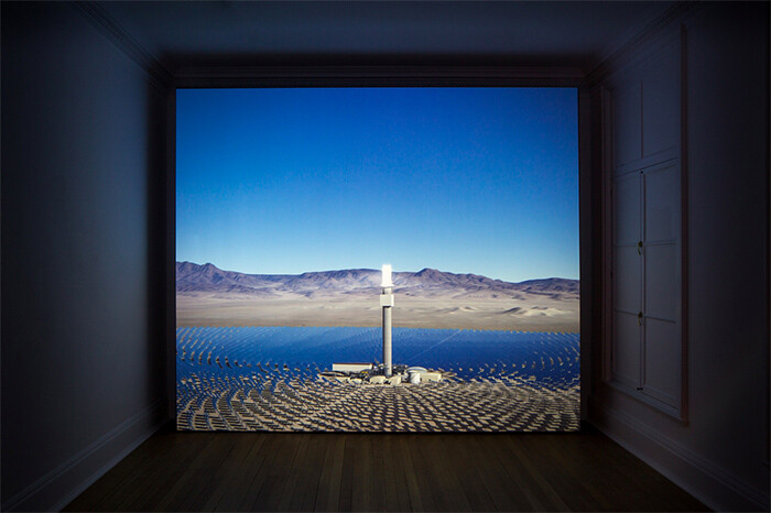 Gerrard also presents Solar Reserve (Tonopah, Nevada) (2014), a projection that animates a CGI model of a billion-dollar solar power plant in Nevada, which utilizes a proprietary digitally controlled mirror system to superheat salt to such extreme temperatures that the plant can produce energy even at night. While it almost goes without saying that these twined works suggest the resource hungry nature of our devices, another pertinent question emerges: how are we positioned within this digital-industrial complex?