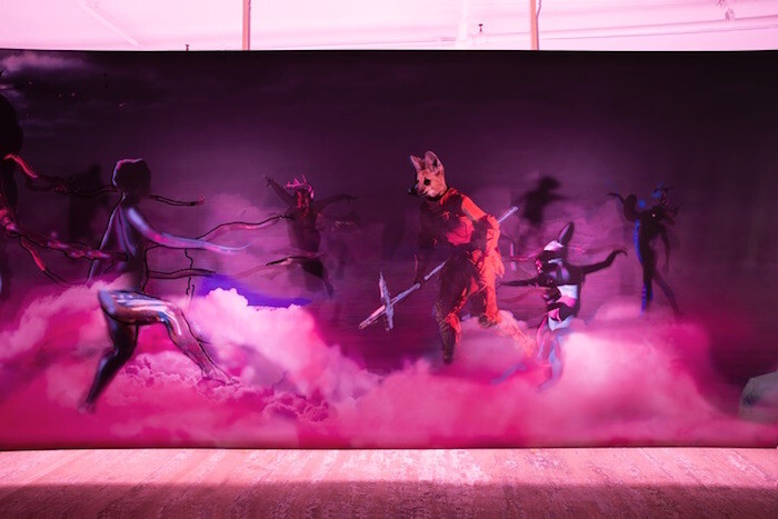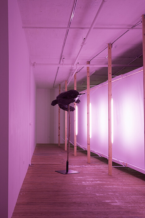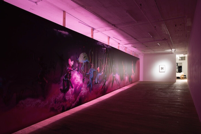 In keeping with a sense of proliferation, the show at Bridget Donahue includes a painting, a print, sculptural objects, and one of Russell’s massive, backlit, diaphanous mural billboards that stretches along the length of the gallery space for 60 feet. Digitally printed on vinyl in apocalyptic—or maybe it’s Martian—red, with a row of pink fluorescent lights behind it, Mirror Mapping the Stars (2015) might also serve as a scrim for the casting of real or imagined fantasies. A male body with a fox head, a female body with a cat head, a skeleton, and more amorphous creatures scamper across a landscape of clouds floating against a night sky. With a scale hinting at nineteenth-century panoramic paintings intended to teach the history of famous places and events, Mirror Mapping the Stars illustrates a future in which everything solid has melted into air.