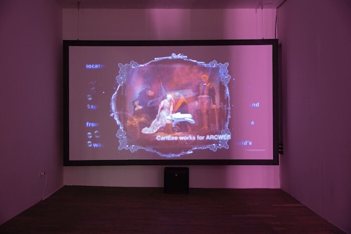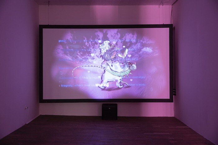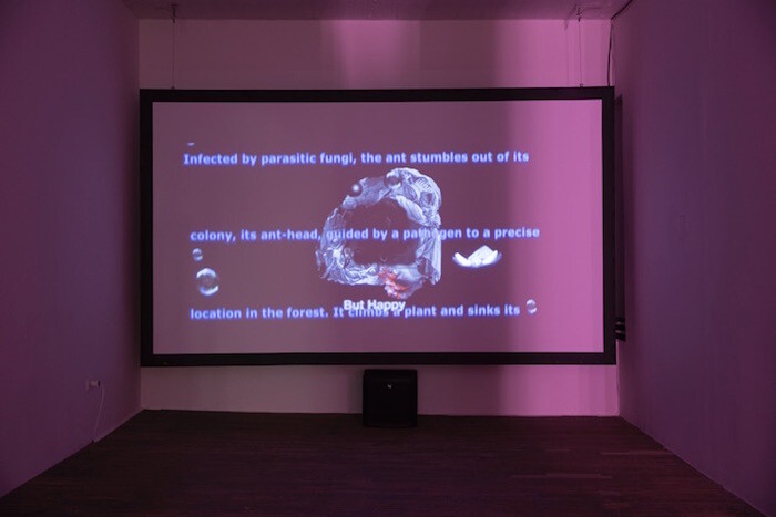 If you visit Bridget Donahue proper, you’ll find a 45-minute digitally animated projected video version of the web page entitled Relaxation Video: SQRRL/BRUCE WILLIS (2015) with ambient soundtrack and Russell whispering parts of the script. Beginning relatively bucolically, and with short poetic descriptions, the work vividly depicts the cyborgization of all living things (from butterflies to humans) with their “tech implants,” and its first snippet from the critical theory canon—Luce Irigaray’s 1980 work Marine Lover of Friedrich Nietzsche—scrolls vertically in blue. Russell creates an immersive world that’s part aquarium, part outer space, while operating as atmospheric backdrop for his primary concern: collapsing sharp distinctions and binaries between natural and artificial, human and animal, female and male, virtual and real.