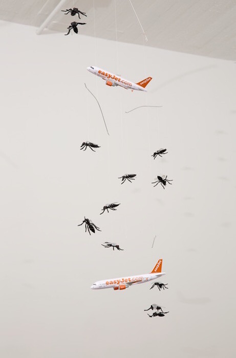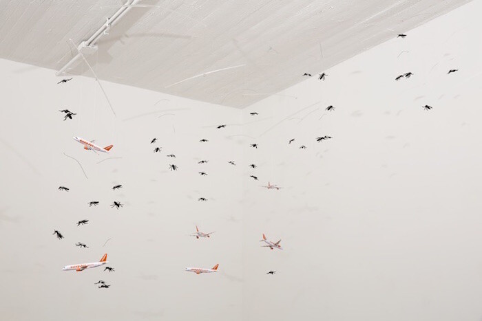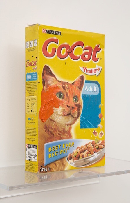 At the same time, Russell hasn’t entirely abandoned more traditional material (art) objects, although they’re mostly clustered in the gallery’s back room: a painting in which organic form and content are rendered synonymous at the dawn of a new era (Untitled [Abstraction of Labour Time/External Recurrence/Monad] II, 2015); three similarly sized boxes, one for cat food, on which he has painted fluid abstractions (all Untitled [Box], 2015); and a mobile (made in collaboration with artist Dan Mitchell) that floats a small swarm of plastic flies and miniature easyJet planes (easyJet/Flies, 2015). At one point, the phrase “A fictional space of desire” appears in Relaxation Video: SQRRL/BRUCE WILLIS. At Bridget Donahue, Russell arrays canvases both virtual and real for the projection of desire, though one not always our own, and one not entirely human.