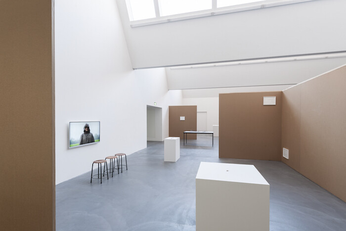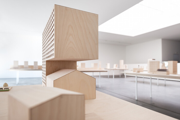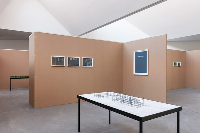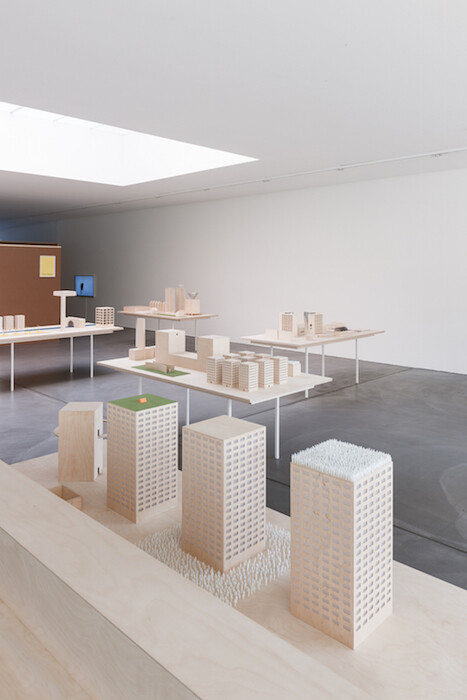 The most prominent piece in the show, A Film About a City (2015), contains dozens of architectural models that are arranged on 10 tables. Again, each scene looks like a lame joke: people piled up on a big ramp that leads to nowhere; a house that contains nothing but a tree; a sole, spacious apartment on top of a slim tower; an endless queue leading into and out of a building; a church surrounded by four buildings with mirrored facades; a high-rise with a meadow and a small orange tent on top; a building that is lifted on one side; and a gigantic billboard, downside green, upside blue, as an abstract horizon.