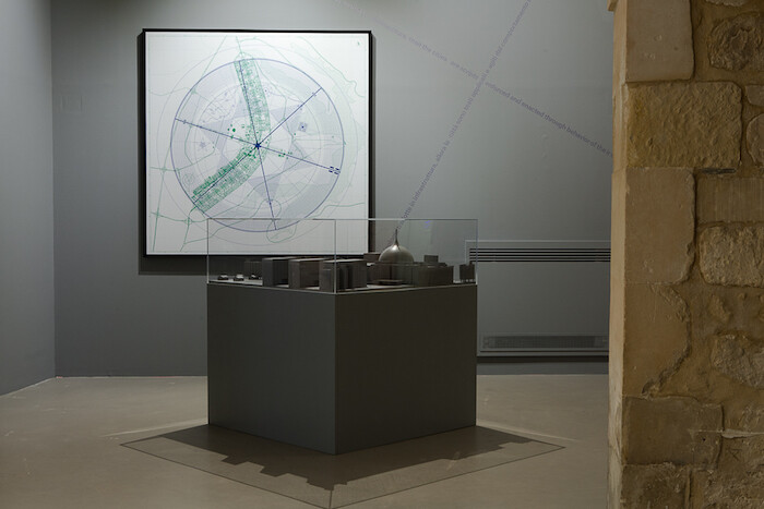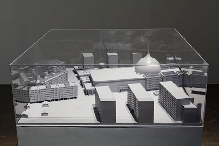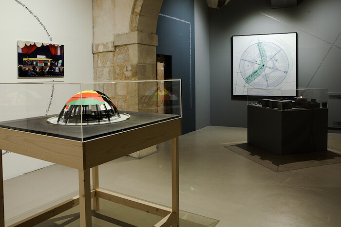 Staal is clearly at home in this role, which has helped him deliver the videos, wall graphics, and architectural models that comprise the dense but viewer-friendly display across the two rooms of Laveronica. The New World Summit is represented here by New World Summit: Rojava (2015–16), which documents the ongoing realization of a “public parliament” for the Democratic Self-Administration of Rojava, in the predominantly Kurdish city of Derik in what used to be north-eastern Syria: a built manifestation of “democratic confederalism” that incorporates both image and text. The other works also relate to architecture and power. Closed Architecture (2011) visualizes an idea for a future prison created by an ultranationalist Dutch MP while she was a student of architecture; Nosso Lar Brasília [Our home Brasília, 2014] conflates two conspicuously colonial social engineering projects in mid-twentieth-century Brazil, the spiritualist vision of a celestial city hovering over the country and its modernist federal capital; Monument to Capital (2014–16) correlates the construction of the world’s tallest commercial buildings and economic crisis.