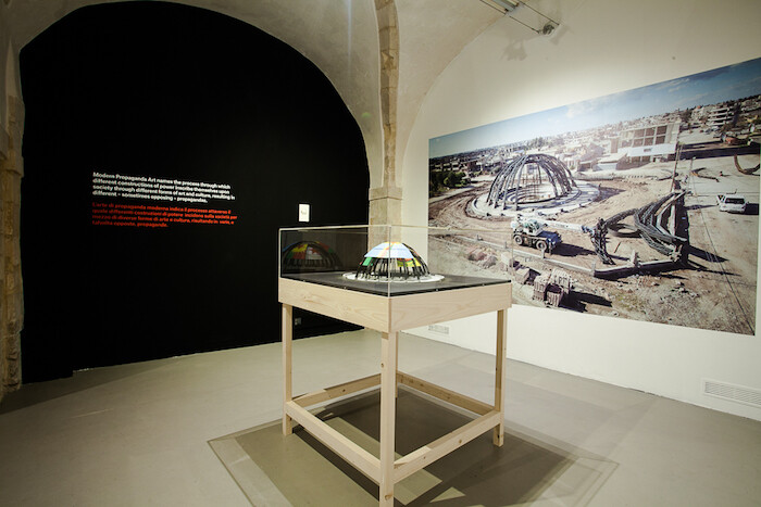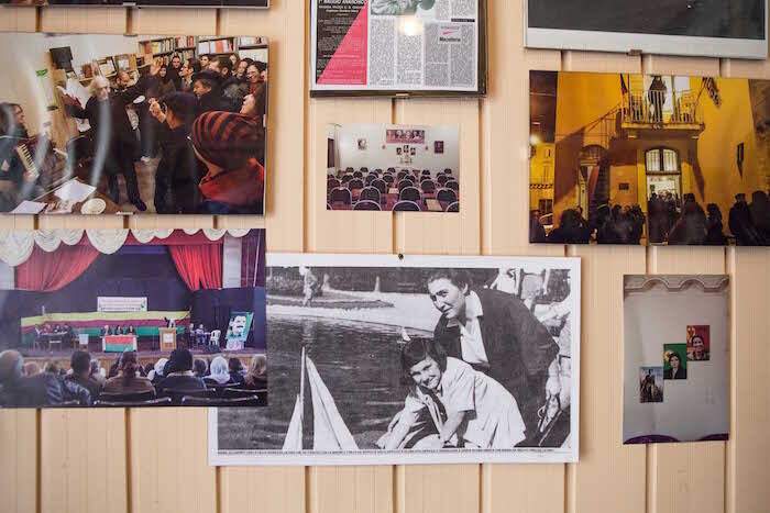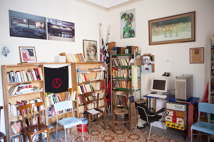 But if your work as an artist starts from a desire to be part of (and act upon) a world of existing ideas, the constellation of the libidinal energy released in real-life political action, its ideological underpinnings and interpretations, and the ways in which all this ends up as Realpolitik, then you must, like Jonas Staal, be rhetorically convincing. And if we leave the visual out when defining “rhetorical,” then we shall have no tools for articulating why the most successful part of “Propagandas” was “Anatomy of a Revolution,” Staal’s lovingly stealthy installation of his color photographs from various locations in Rojava in the offices and archives of the monthly anarchist newspaper Sicilia Libertaria. Its modest townhouse is in Ragusa, another late-baroque city just a half-hour car ride away from Modica. The photographs—not exactly snapshots, but journalistic rather than “artistic”—hold their own between crammed bookshelves, on early 1980s plastic wainscoting, under ceilings plastered with back issues of the newspaper, without being clever or becoming pastiches of historical modes of visual political engagement. They channel the radical open-endedness of what Rojava, against all odds, is seeking to achieve. The whole thing doesn’t feel “designed” at all. Again, no mean feat.