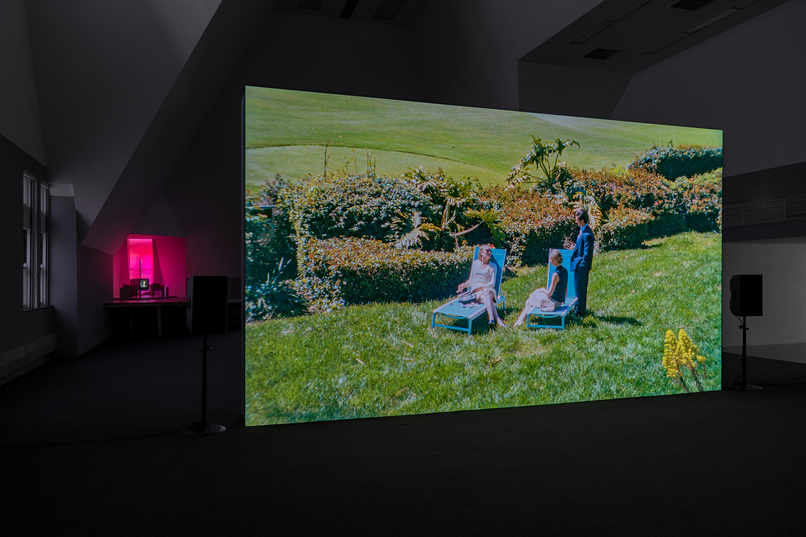 “The Kennedys. Palm Beach. A charge of rape. It all made for a real-life soap opera in May 1991 that resulted in an arrest, a trial, and non-stop cable TV coverage.” So reads a recent Miami Herald summary of William Kennedy Smith’s trial, when John F. Kennedy’s nephew was acquitted of raping a twenty-nine-year-old woman.1 New York-based artist Jordan Strafer fictionalizes that case in “DECADENCE,” an exhibition at the Renaissance Society showing two films back-to-back on a large standing screen, starting with LOOPHOLE (2023). Clocking in at twenty-four minutes (the standard runtime of a TV episode), and filmed in the style of a 1980s soap crossed with a true crime reconstruction, LOOPHOLE draws on sociolinguist Gregory Matoesian’s observations on the “matrix of language, law, and society” that he saw mobilized in Smith’s court proceedings “to create and recreate cultural hegemony”—which Matoesian found to be inextricable with patriarchy.2 Echoing Matoesian’s findings, Strafer zooms in on what Matoesian described as the poetic, aesthetic, and “persuasive rhythms of trial talk” designed to “organize and intensify the inconsistencies in the victim’s account and shape them into a cumulative web of reasonable doubt.”