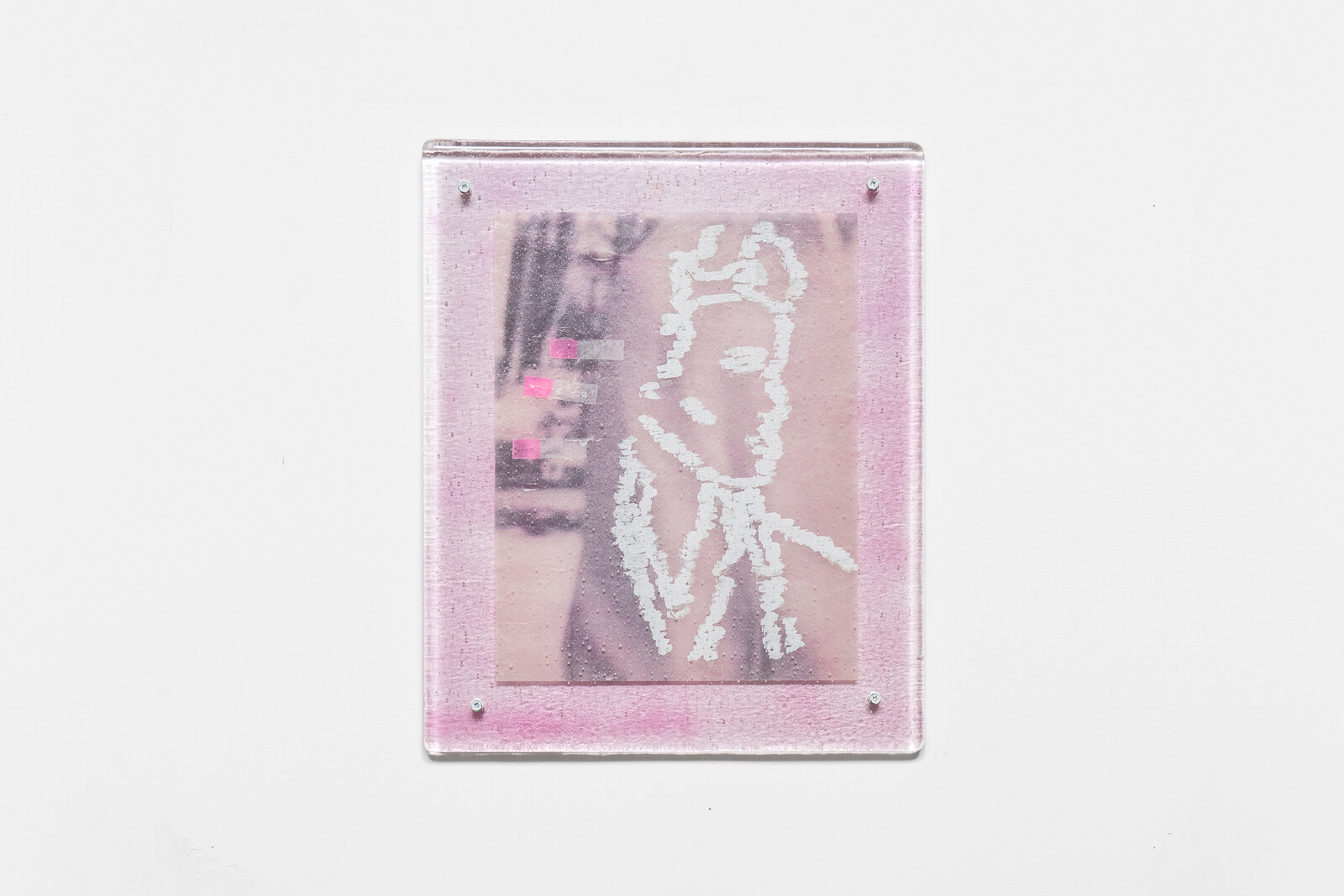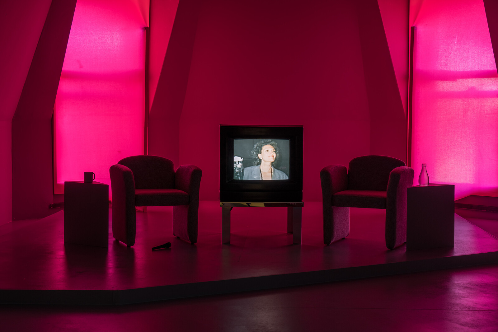 But that staccato aggression dissipates when Smith takes the stand and sings Frank Sinatra’s “Summer Wind,” as if to demonstrate his impunity as a member of the American ruling class. That smooth, self-satisfied indifference is displayed throughout LOOPHOLE, which remains faithful to its source material down to the defence attorney’s relationship with a juror he eventually married, and to Strafer’s mother’s role in the defence team. (Her image, taken from Newsweek’s trial coverage, is frozen on the mini TV set bordered by two miniature seats modelled after those used for Oprah Winfrey’s talk show, which composes the installation Channel 2 (2024), in a corner alcove of the gallery. It appears again in three works on paper, encased in fused glass, which are displayed in vitrines on three different floors of the building.) In the film, her character is introduced in a segment composed like the intro for a spin-off show—think Ally McBeal crossed with NYPD Blue—titled “The Pen.” In an office, she drafts questions the defence attorney poses at trial, emphasizing his role’s performativity and the invisibility of hers. When her face fades into the accuser’s, often blurred by a circle as it was when the trial was televised, both women’s instrumentalization within America’s legal framework become linked: one is a tool, the other is a victim (or not).