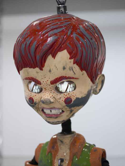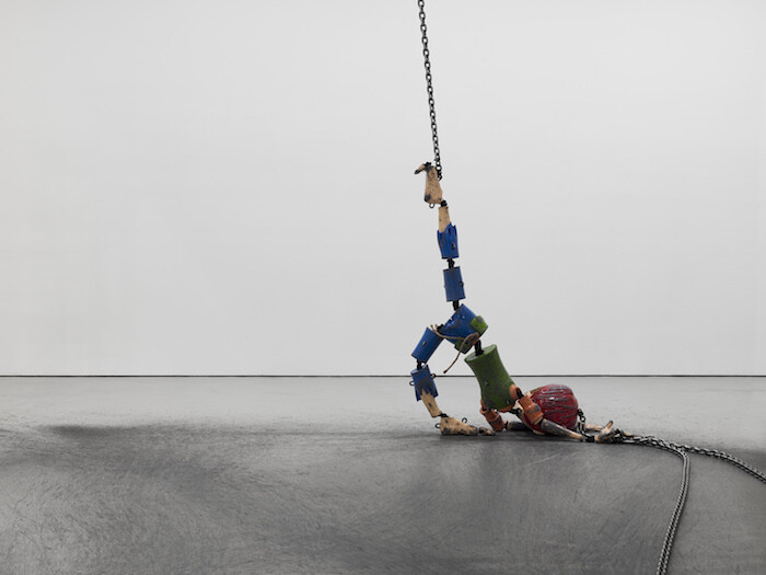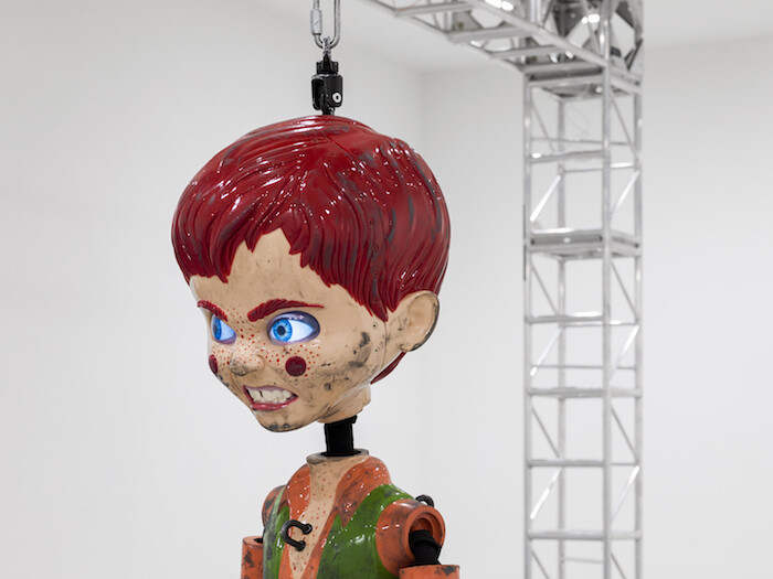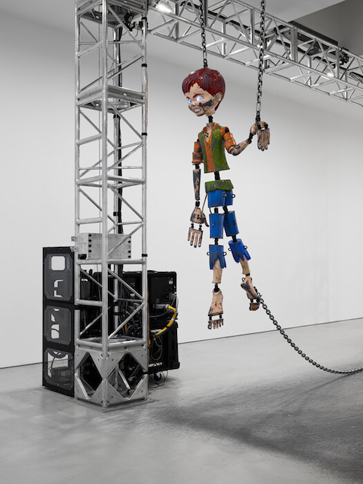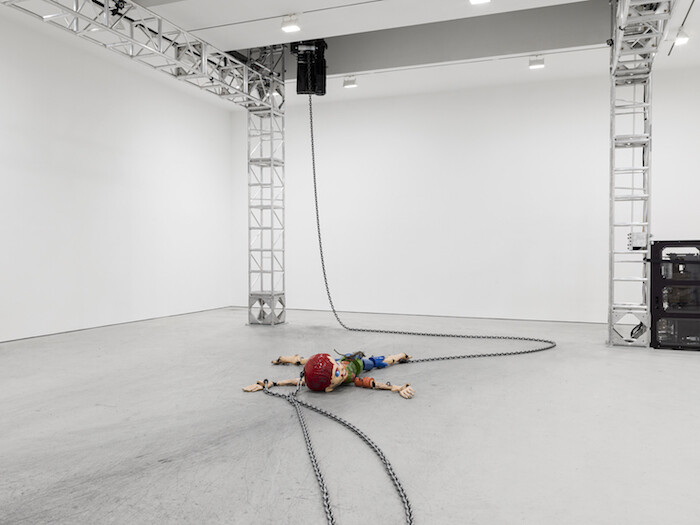That vision is an inanimate Colored sculpture (2016) of a lacquered, wincing boy, cut up and marionetted by a brutal contraption of chain pulleys in such a way that he is popularly referred to as a robot. This is likely because Wolfson’s breakthrough work, Female Figure (2014)—exhibited at his first solo show with David Zwirner—more conventionally resembles a robot. Two years ago, in my memory, the virality of that animatronic creature might only have been bested by Christian Marclay’s family-friendly film (fetishizing the accumulation of fathomless labor) The Clock (2010), which was still making its rounds of ever more popular museum screenings. As one of its moment’s most visible artworks, Female Figure has an undeniable place in history—and as a display of coalesced abuse and pageantry that compounds this momentum, Colored sculpture is an epoch-defining artwork (from an age of increasingly abbreviated epochs).
