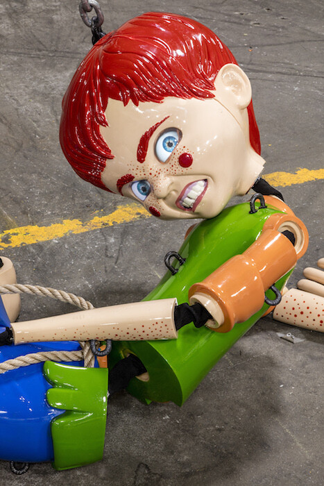 One worries in case the eyes break, as a cracked screen lacks the charm of a chipped arm or disfigured face. They’re a point of weakness in more ways than one. Amid echoing acoustics that recall a high school gymnasium, a male voice (the artist’s) sounds as if he’s resigned to reciting his own words in public, with adolescent opacity: “two to kill you, three to hold you, four to bleed you, five to touch you, six to move you, seven to ice you, eight to put my teeth in you”—throughout these words, the eyes affect a cartoonish trance as they are overlaid with dancing chocolate bonbons with icing spirals, like icons from a slot machine—“nine to put my hand on you, ten to end inside your hair, eleven you’re right over my shoulder, twelve your mouth full of coffee, twelve I knew you, thirteen I killed you, fourteen you’re blind, fifteen you’re spoiled, sixteen to lift you, seventeen to show you, eighteen to weigh you.” After a still denouement: “Spit. Earth.,” the figure crashes and is hoisted up by the skull to be bashed against the ground again and again as it inches across the room. A snippet of “When a Man Loves a Woman” blares and cuts to silence—the kind of menacing audio cue one might expect from a haunted Victrola or as the soundtrack of psycho killer prepping their scene.
