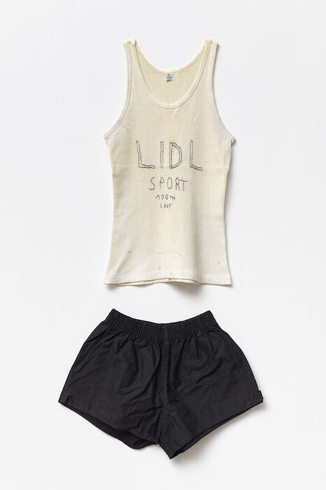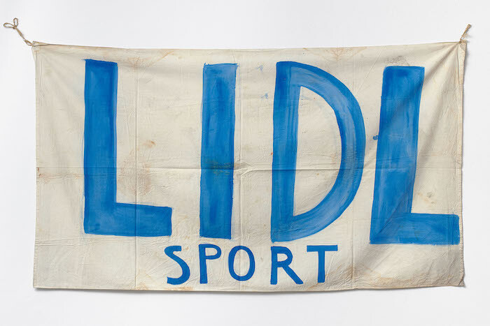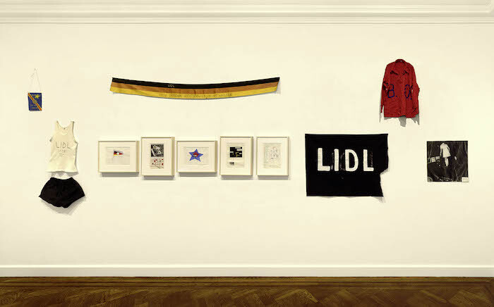 Many of the materials on view at Werner are essentially homemade props: a LIDL flag like the one flown from the roof of the occupied Kunstakademie (LIDL, 1969); sportswear for the LIDL Olympiad (100 Meter Lauf [100 Meter Run], 1969); the wooden LIDL-Block (1969), painted in the colors of the West German flag, that Immendorff used in one of his crypto-absurdist protests at the Bundeshaus. None of these objects is artfully made; instead, they exude the kind of unschooled, everyone-is-an-artist stylelessness that more recent artists like Thomas Hirschhorn have used to try to dehierarchize the entrenched class stratifications of the art world.