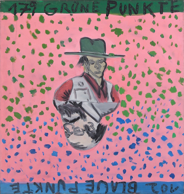 This reorientation took place in the latter half of the 1960s, at the same time that the political and cultural landscape of West Germany was undergoing a massive transformation due to the ascendance of the New Left and the emergence of youth countercultures. At the beginning of this period Immendorff was mainly working in a faux-naïf mode, painting blithe cartoons of babies (Zwei gelbe Babies [Two Yellow Babies], 1967) and forest animals (Laufen [Running], 1965) while taking playful potshots at art world grown-ups like Beuys or the local gallerist Alfred Schmela (Blaue Punkte/Grüne Punkte [Blue Dots/Green Dots], 1965). The work has a kind of willfully immature, post-Pop sensibility; the precedents of Polke and Konrad Lueg are clear.