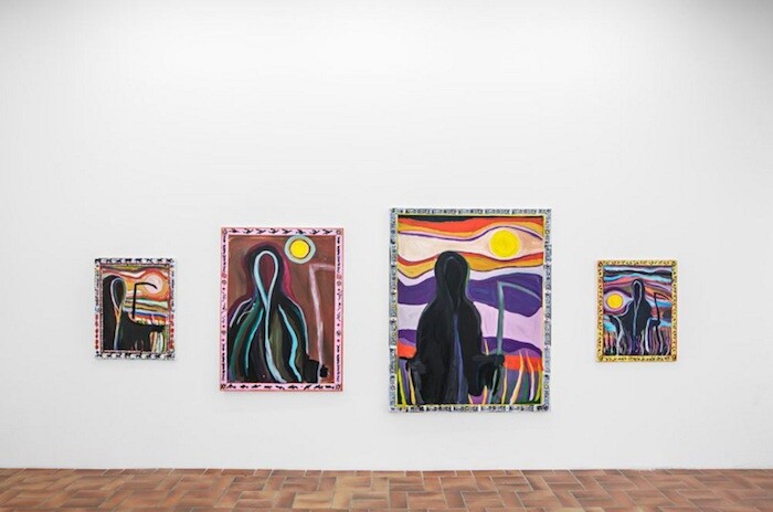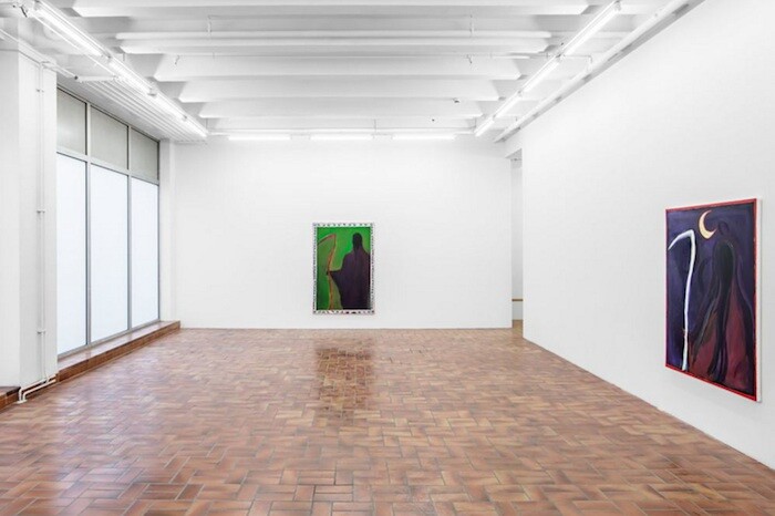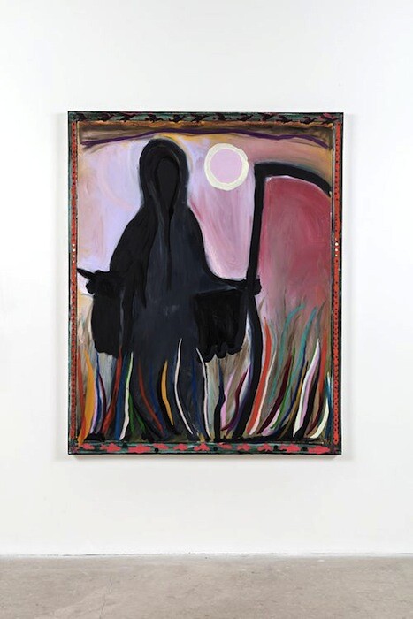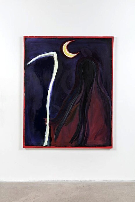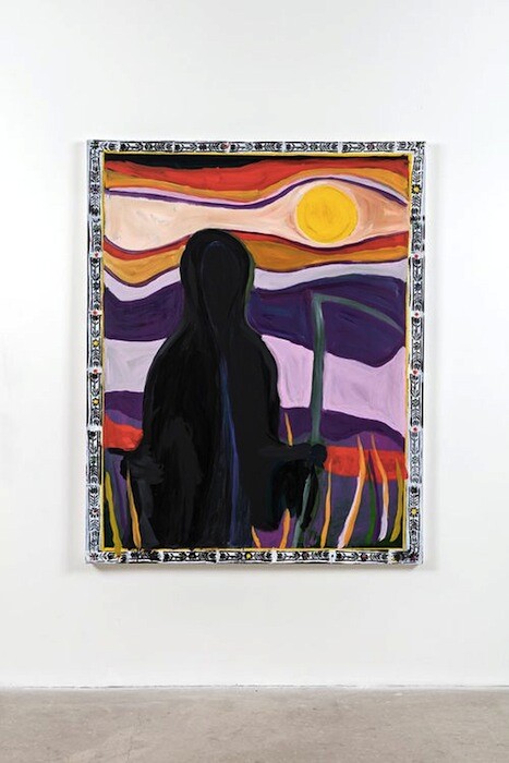 The visitor to Josh Smith’s show at STANDARD (OSLO) is faced with 11 Grim Reapers painted in oil on canvas, all of them equipped with the customary black robe and scythe. Smith’s angels of death are not solitary, otherworldly figures, but a motley crew rendered in a seemingly slapdash manner, like the paintings you come across in flea-markets and thrift shops. The kitschy feel of these paintings recalls one reviewer’s description of Smith’s recent work as “Edvard-Munch-goes-to-the-Bahamas,”1 but here the cardboard sunsets are relocated to the Northern Hemisphere. The most Munch-like of these works—including Time for Yourself and Easy on the Being (all works 2017)—are grouped together, but the majority are presented in relative isolation on the gallery’s white walls.
