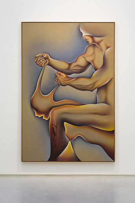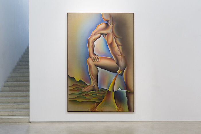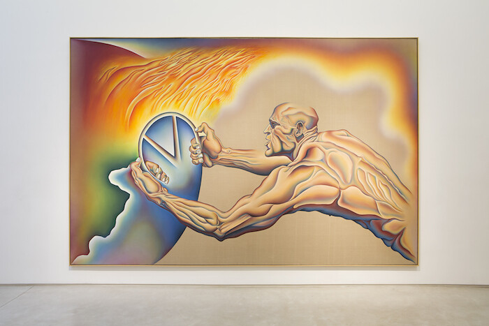 Four large-scale paintings in the main gallery figure variations on a male nude in a wash of taupe and technicolor. In each, he appears bald, white, and muscled, engaged in the performance of symbolic action. Driving the World to Destruction (1985), for example, shows the surface of a bald man’s torso, its hypertrophy defined by dark shadows. His overlarge hands hold a steering wheel affixed to the surface of the earth, whose deep greens are caught in a swirl of flames. In their rendering of male violence, these allegories are not complicated.