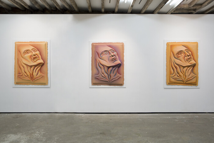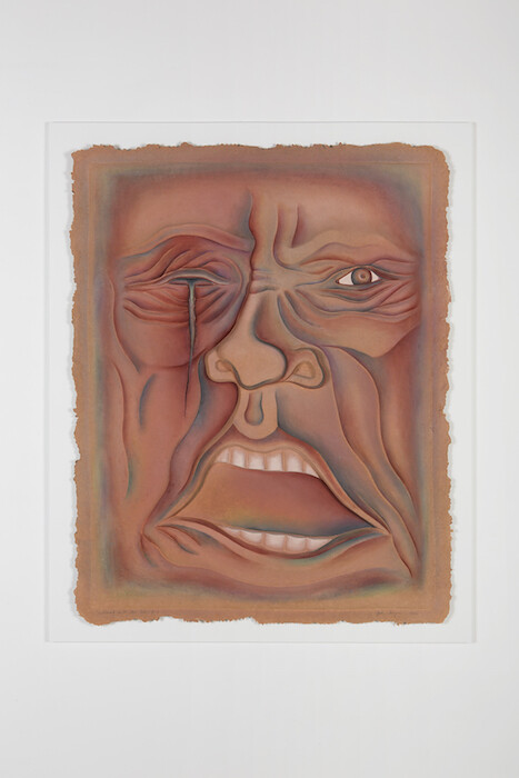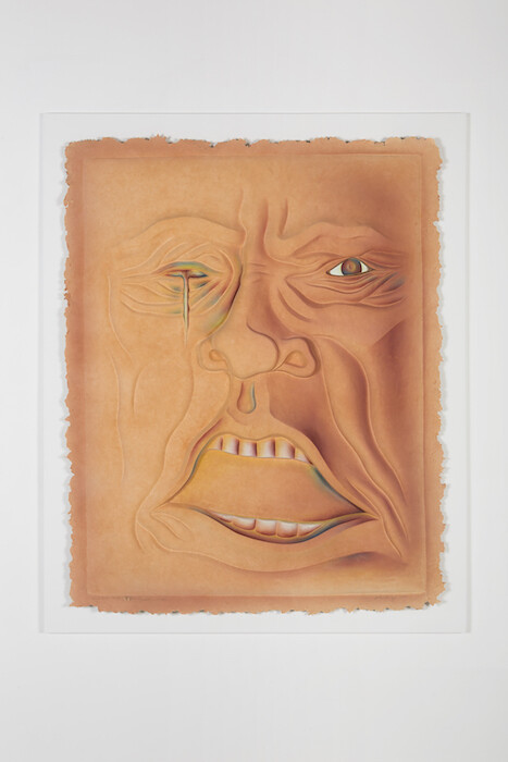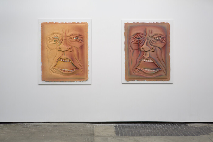 A second gallery location in Freeman Alley housed an additional suite of works on paper, whose surface is sculpted to protrude from its frame. (This part of the exhibition is now closed.) Two among these works qualify the show’s claim to prophecy: Doublehead with Green Eye Lid #2 and Doublehead with Tom Tear #12, both executed in 1986, are uncanny in their likeness to a contemporary Donald Trump. Like portraits. Their mouths gape mid-grandiloquence. The former is even rendered in powdery orange.
