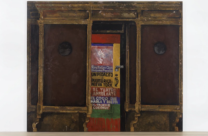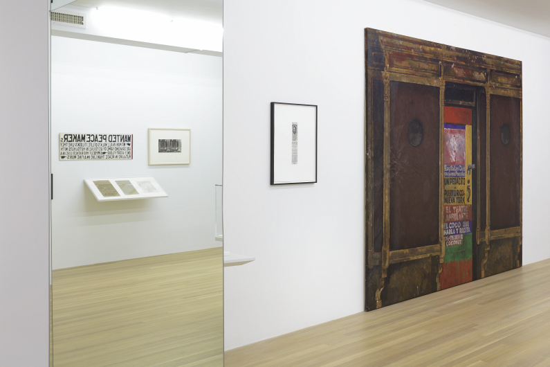 What is New York at each moment of Julie’s work? You wouldn’t find an answer in the show, though there are plenty of clues. Wojnarowicz’s late 1980s black-and-white economic photographs with ants marching on loose dollars and clocks (Untitled (Time/Money) from “Ant Series,” 1988) and a buried self-portrait, Untitled (Face in Dirt) (1990). And Wong’s large 1986 painting Untitled (Poetry Storefront), along with his hand-written press release for Semaphore Gallery in 1985, in which he tells this story of this kid Pedro holding a knife to a restaurant owner, failing, and then crying for being a wimp, his bully-friend saying “guess he just doesn’t have the heart for the business,” in a time “when dinner for six was deep fried half & half (gizzards and hearts) Cheetos Ding-Dongs…”. These objects felt to me like specters from a time long gone, New York City ghosts. Well, deep in East Brooklyn and far up in the Bronx where the tech folk don’t reach, pushed farther and farther away from the city center, people are still living the abandoned life described by Wong. The canvas of the old Puerto Rico “storefront” is almost to scale, so that if you dare open the door and enter you can still hear echoes of the “talking coco-nut recite you four-on-the-spot poems for $2”!