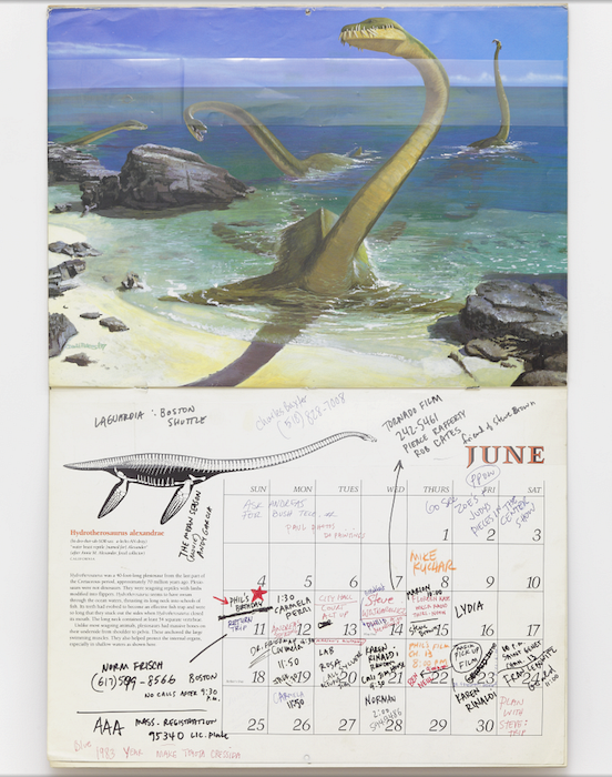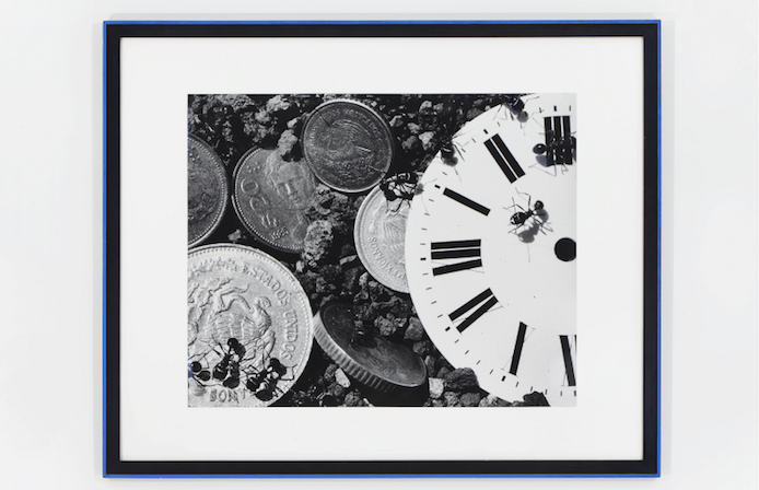 Diagonally opposite of Wong, literally and figuratively, is Wojnarowicz’s Untitled (Time/Money) from the “Ant Series” also from 1988, a photograph of ants crawling in the dirt around some coins and a watch face. Like so much of Wojnarowicz’s work, it’s a timeless image that nevertheless manages to capture the righteous anger of the generation that produced it. Ault’s decision to alternate work by Wong and Wojnarowicz with archival artifacts of both—fire gear given to Wong by friends, Wojnarowicz’s calendar and his gift-shop Wunderkammer “Magic Box”—summons the competing historical and aesthetic injunctions of the exhibition format, actively crossing and re-crossing the boundary between memorial and intervention.