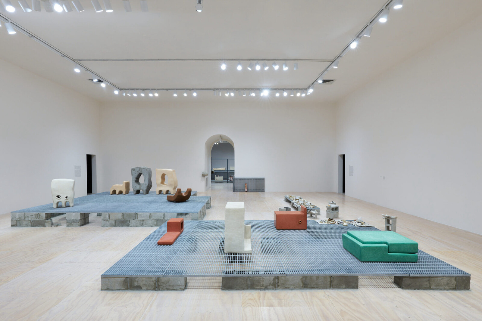 Throughout the exhibition, Manna borrows from the visual and organizational language of archival institutions; the steel grates which she uses to exhibit her various sculptural works evoke other spaces of knowledge production and preservation, while the cement blocks are reminiscent of construction sites. The everyday and mundane are recontextualized and transformed into objects to be exhibited. In Old Bread International (2022), ceramic sculptures of loaves are laid out on newspapers, mimicking the practice of leaving leftovers on ledges or hanging in bags for hungry passersby rather than throwing them away. The sculptures, in differing stages of decay, are testament both to bread’s role as a source of life, and the excesses that generate food waste.