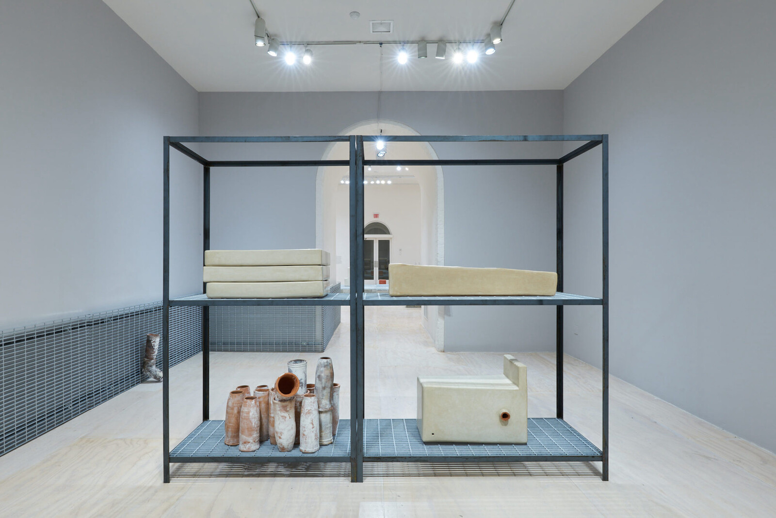 The exhibition includes recent and newly commissioned sculptural works; pieces from the multidisciplinary Palestinian artist’s ongoing “Cache Series” populate the main gallery space. These large, smooth, earth-toned ceramic sculptures seem capable of shape-shifting despite their sturdiness. Inspired by the khabyas—the storage vessels attached to homes throughout the Levant that have been rendered superfluous with the proliferation of modern means of refrigeration—they capture these structures in various states of disintegration and ruination. Some share recognizable features of the original khabya while others have morphed into unfamiliar forms, alien-like creatures whose disfigurations speak to their incongruity in the contemporary landscape, glossy monuments to their own demise in the face of industrialized means of producing and conserving food.