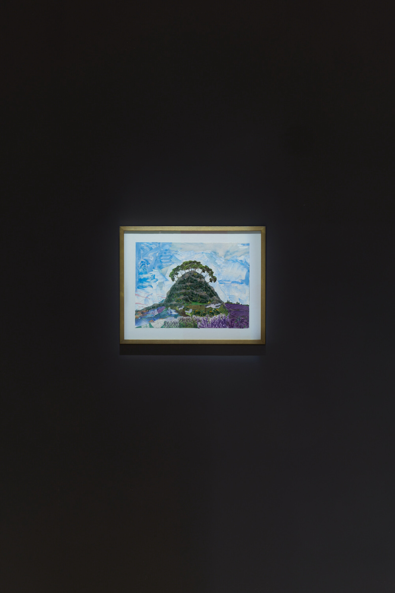 At the entrance to each of two screening rooms hangs a small collage, a recent development in Manna’s practice. In Mountain (2018) and Weed Bouquet (2020)—a landscape and still life respectively—she uses labels from discarded household cleaning product containers to create compositions that both evoke and undermine Western genres. Colorful and vibrant, these textured works on paper are quietly compelling. The repurposing of packaging is at once unnerving and reassuring; if the ability to render waste materials alluring is initially appealing, such deception ultimately serves as a reminder of the empty promises of these contrived scenes.