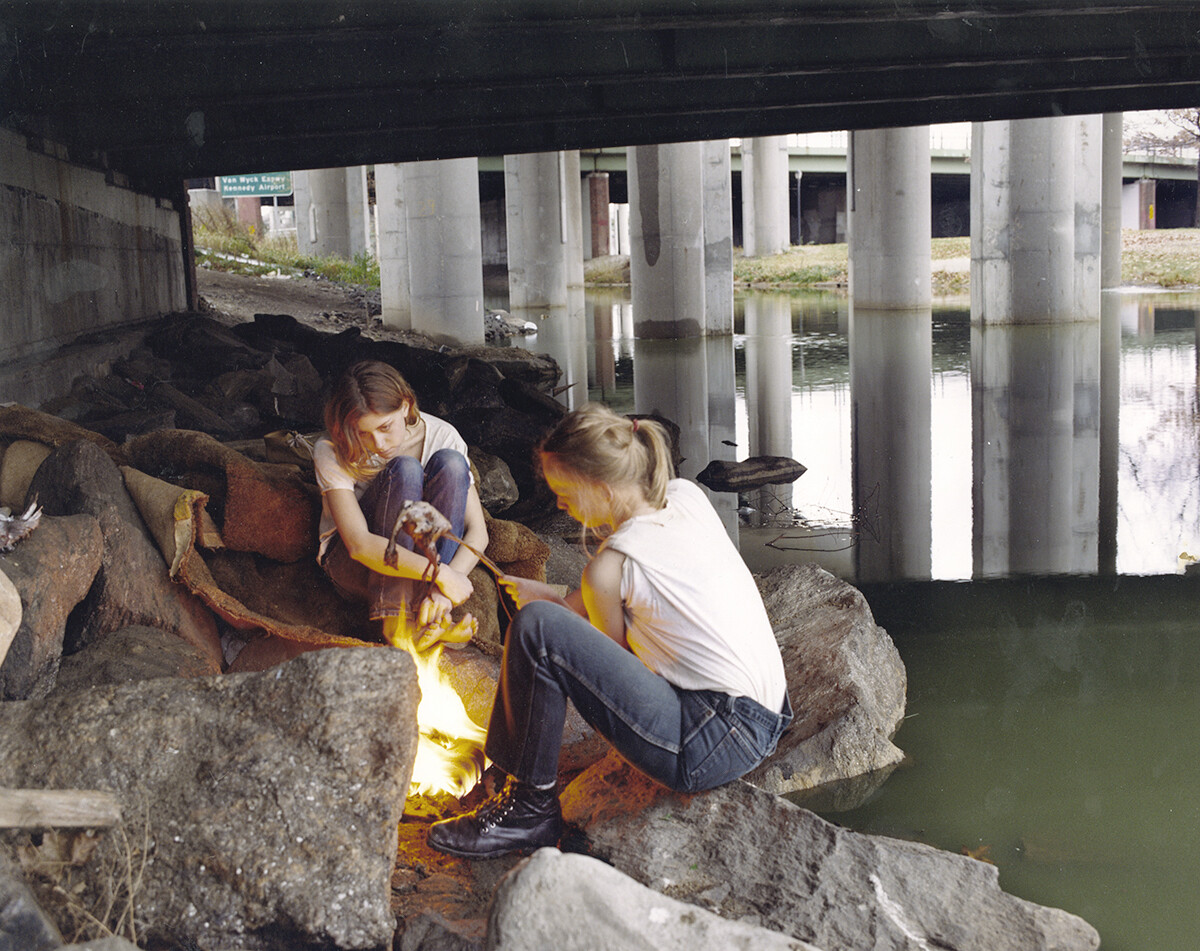Metaphorically—and to a certain degree literally—Kurland’s images look and feel as if they are from the last moment in US history when one could both get away and not be sold back to oneself. The elusiveness of Kurland’s girls was also inspired, as she writes in an essay at the end of Girl Pictures, by runaways and renegades. So much in these images is just on the cusp: of womanhood, of homoeroticism, of danger, of death, of becoming feral (or domesticated). Shelters, whether makeshift tents or abandoned cars, are temporary. These are strands Kurland continued to pursue when she drove around the United States in a customized van with her young son between 2004 and 2016 photographing trains, transients, and people and places existing on the economic, geographic, and cultural margins. (Before that, she spent a year taking photographs at agrarian communes.) But for her “Girl Pictures” series, establishing community is as important as fleeing it, and the connections between the young women in the photographs are as crucial as the frequently idyllic settings in which they occur.