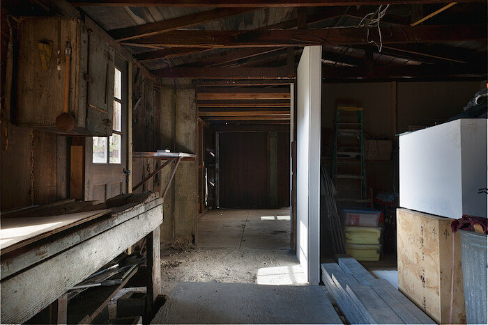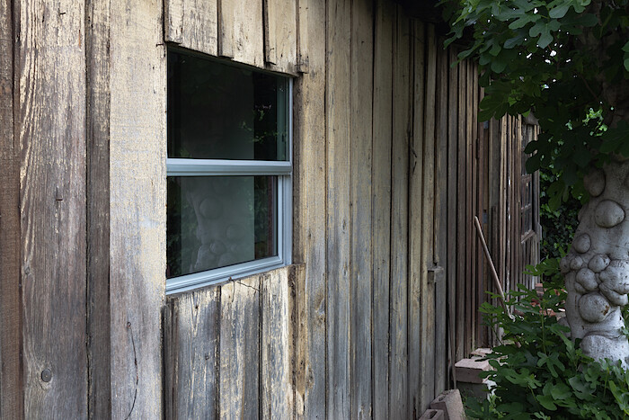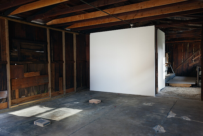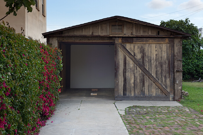 Since it is impossible to say—in the work of K.r.m. Mooney just as in the world—where one thing ends and another begins, it seems appropriate to start by considering the structure that houses this exhibition. An ancient wooden shed, it was once a garage for the large Craftsman home it sits behind, built in 1906. Wide sliding barn-like doors open onto patched timber walls and a cracked concrete floor stained from years of dripping motor oil. Weeds sprout through some of the cracks and papery pink bougainvillea petals blow in from the garden. As a concession to the aesthetic formalities of the white cube, a pristine white rectangle of wall divides the front gallery from the storage area behind.