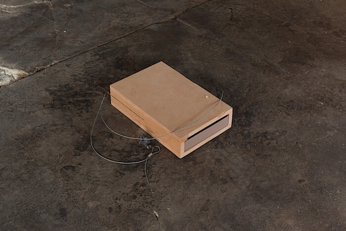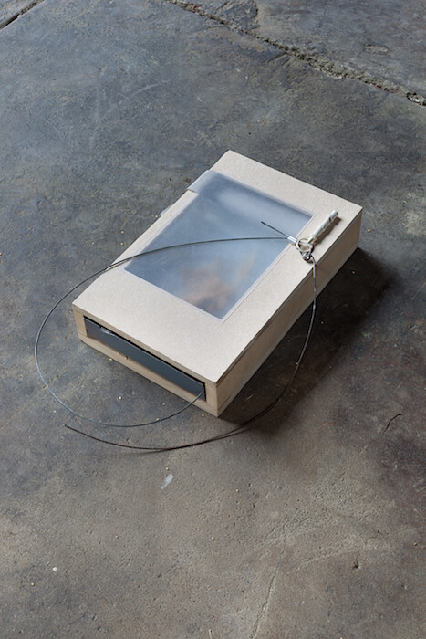 There are only two artworks on the checklist, though the exhibition—titled “Oscine”—comprises many more parts. A case in point: the first work on the list, Accord, a chord (all works 2016), consists of two small box-like sculptures placed on the floor of the gallery. A diptych, if you like. Their dimensions reminded me of external hard drives or books—dictionaries perhaps. Both allusions are pertinent. As with most of Mooney’s work, each is a combination of modified and crafted elements: in this instance, composite particle board, steel cable, and aluminum sheeting along with less prosaic items like a cast silver chanterelle mushroom and a silver-plated dog whistle. The work’s title points to the dynamic between harmony and individuation that informs Mooney’s choice of media.