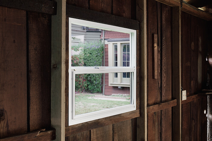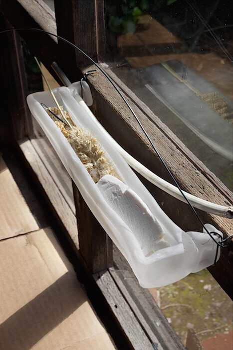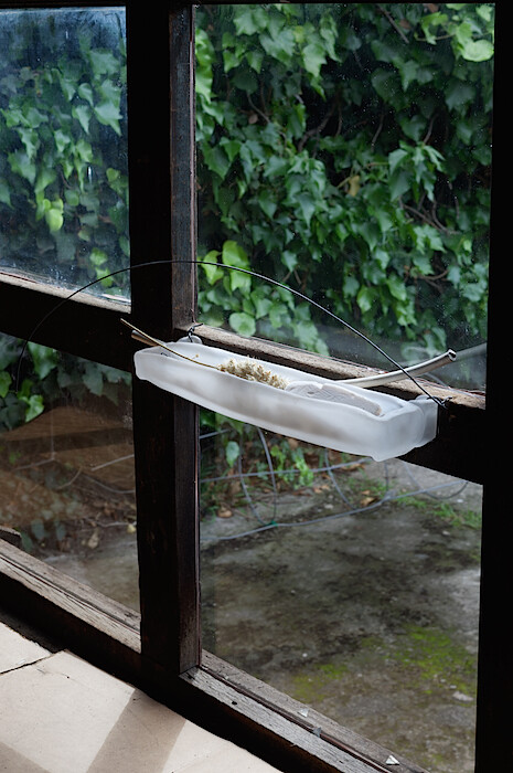 More substantial, though unassuming in a different way, is the aluminum-framed window that Mooney has fitted in place of the former wooden one. Its light-industrial styling offsets the rusticity of the space and of the natural elements in the exhibition. The indeterminacy of the window, which is both an object unto itself and a mediator between the architecture, its location, and its contents, is analogous to Mooney’s sculptures’ interaction with their surroundings. Is the gap between the window and the wooden wall a part of the window? I would have to say yes. What about the light that is filtered through its glass? And what about the light when—as on my visit—the window is open?