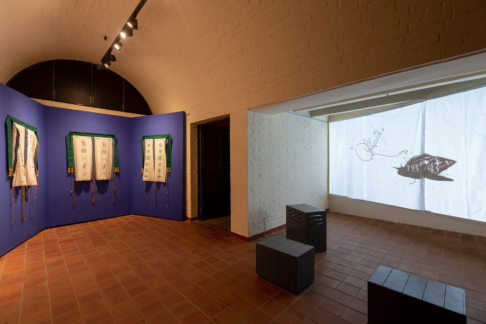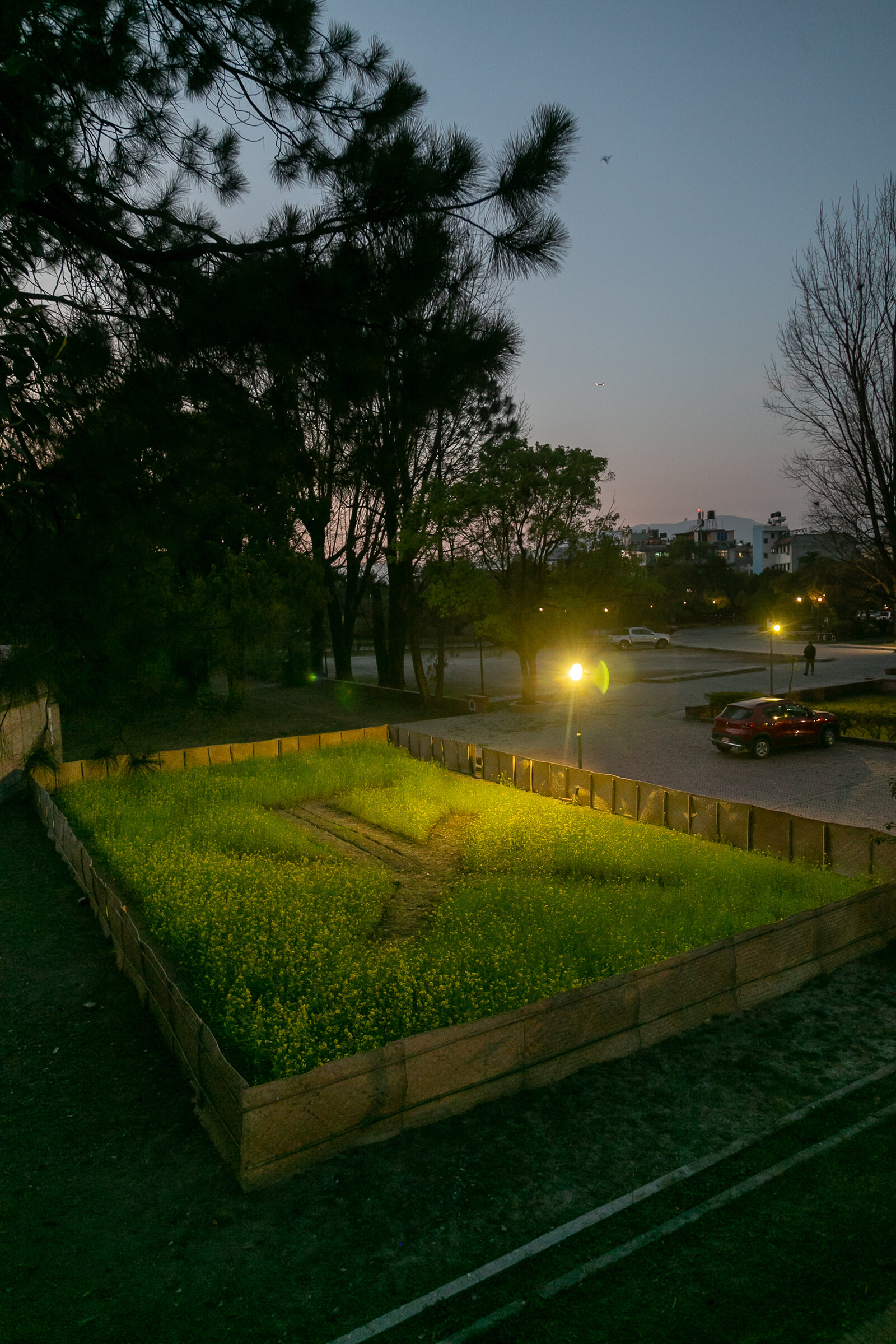 At the Taragaon Museum, full-scale investigations into agricultural justice and gardening are launched. Perhaps most aligned with the Triennial’s precursor exhibition “Garden of Six Seasons,” at Para Site in Hong Kong, the works in this venue examine the human impulse toward tending and forming landscapes.1 Uriel Orlow’s Tori Bari (After Yellow) (2022) is a transplanted garden of oriental mustard with culinary and medicinal use, documented as early as 5,000 years ago, sown in the shape of a mustard mill from Khokana. Chang En-Man’s Snail Paradise: Preface (2019) is a mixed-media installation which includes three pairs of Pacavali men’s trousers cross-stitched with her own designs, showing the invasive species of the African giant snail, the plants it eats, and the paper mulberry tree—a symbol of the Austronesian peoples which was taken on early journeys through the archipelagos of the Asia-Pacific in order to be transplanted in new climes. At Kathmandu—a matrix of ethnicities, religions, and culture—this landmark triennial stages, and interrogates, human relationships both with the natural world and with sacred spaces of art. The vastly different timelines, processes, and perspectives on display sit together in intimate tension, forming what we might call a decolonial—rather than post-colonial—discourse. The triennial moves toward the possibility of another canon, asking us to look at our world from the perspective of a future, winning resistance.