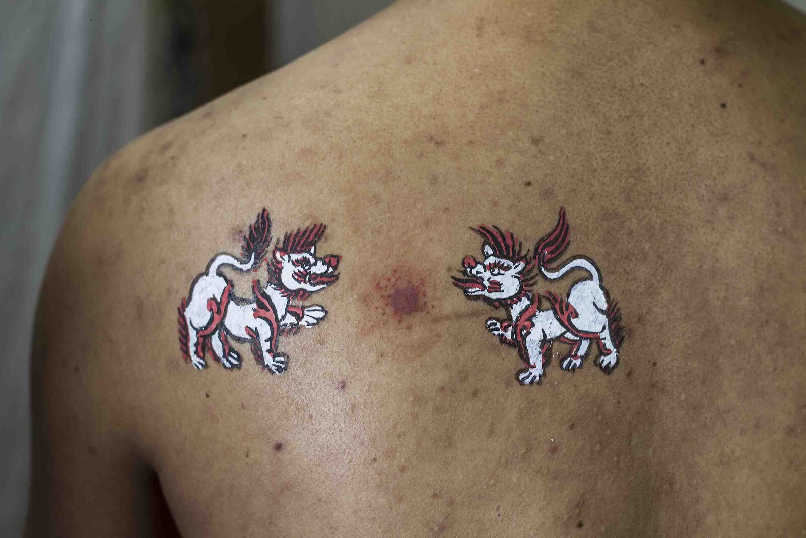 In the Patan Museum, one of the former royal palaces of the Malla Kings of Kathmandu Valley, master painter Lok Chitrakar’s work keeps the Paubha painterly tradition alive, both in his intricate Buddhist depictions and in his construction of painting as a healing practice. In Healing Lions (2018), we see photographs of two sacred lions drawn by Chitrakar around a shingle eruption on the skin, a healing technique typically reserved for Brahmin healers. Many artists shown here have adjusted traditional methodologies, shattering allegiances to predetermined forms of knowledge or knowledge production in order to reflect on the present. The Karnali Arts Centre transform the oral tradition from the Karnali region, which traditionally comprises song and dance of the Mahabharat epic, to speak instead to the discrimination faced by Dalits and the fraught relationship between rural communities and elected leaders. Their presence in NAC manifests in a single-channel video, Bharta (2019), along with a live performance which took place during the opening days of the Triennale.