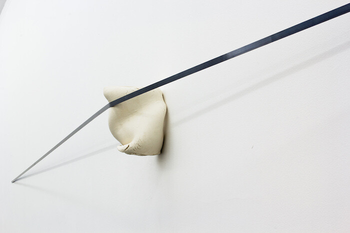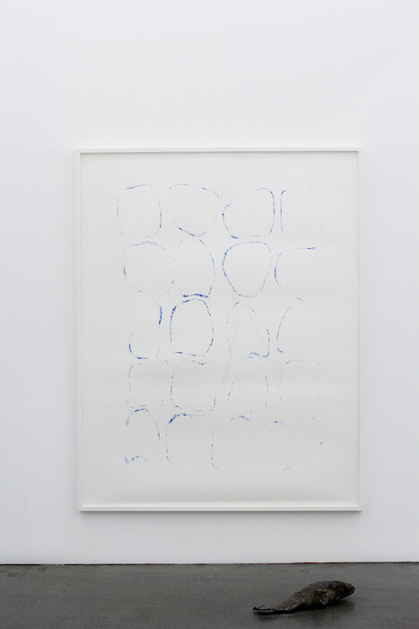 Around Grosse Liegende a series of subtle references is orchestrated. The large monotype of April Sculpture (big blue print) (2016), printed using the ceramic cylinders of a sculpture made last year, echoes La part de l’autre (2017), a sculpture composed of two similarly rounded elements. This, in turn, extends into Throat (N and S) (2017), two photographic studies of the neck as cylindrical connection and support.