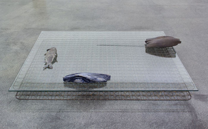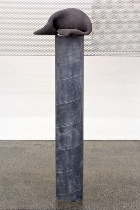 If Bock’s exhibitions are texts then “Smog,” her third solo show at Berlin’s Meyer Riegger, is particularly poetic. Two rooms are arranged as if they were two long sentences, rich in subordinate clauses and parentheses; sentences that could have been written by Marcel Proust, full of internal symmetries, of repetitions and variations, aimed at pursuing a nuance of perception or memory. The first room revolves around Grosse Liegende (2017), which is made out of several elements: a horizontal support (an old mattress coil topped by a glass pane), upon which the artist has placed the metal mold of a fish, a matte brown ceramic sculpture, and another ceramic sculpture with abraded blue enamel. The spectator perceives, in a fluid transition that renders the distinction between figurative and abstract superfluous, three variations on the same tapered and organic form.